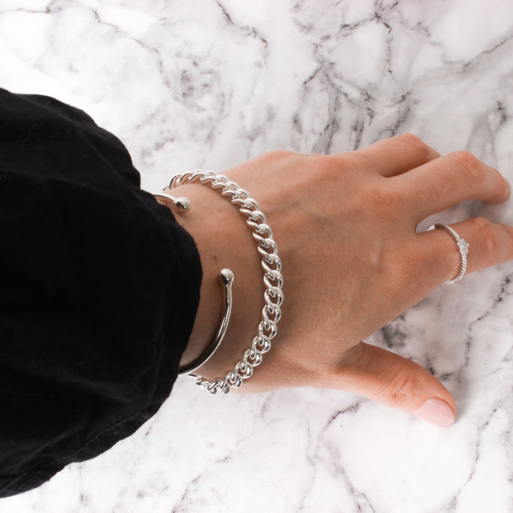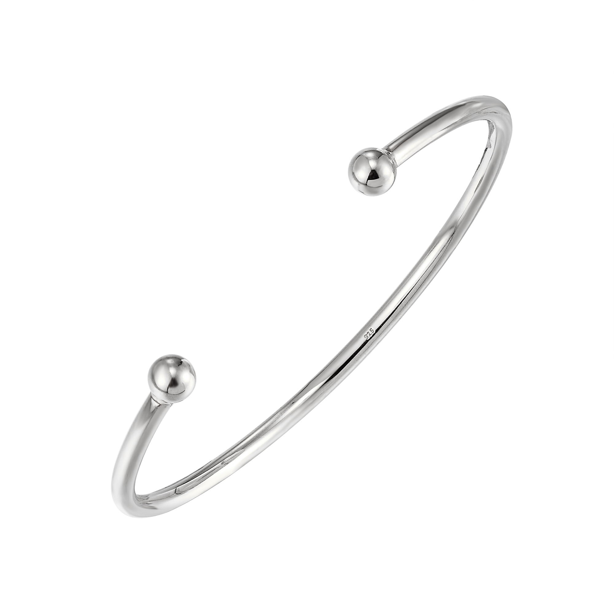 Understated and elegant, the gleaming sterling silver bangle can be worn night or day and easily slips onto your wrist, with two bold spheres on the end of the bangle completing the style. It makes a wonderful gift for a loved one or as a treat for yourself to add a touch of glamour to your jewellery collection. Comes presented in a gift box making it ready to gift.