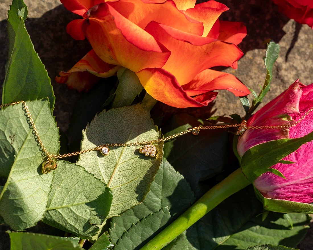 The centrepiece is a beautifully detailed elephant charm, a traditional symbol of strength, wisdom, and luck. Set with high grade Cubic Zirconia stones, the charm provides a brilliant, diamond like glint that complements the rich, warm tones of the 18ct gold plating.