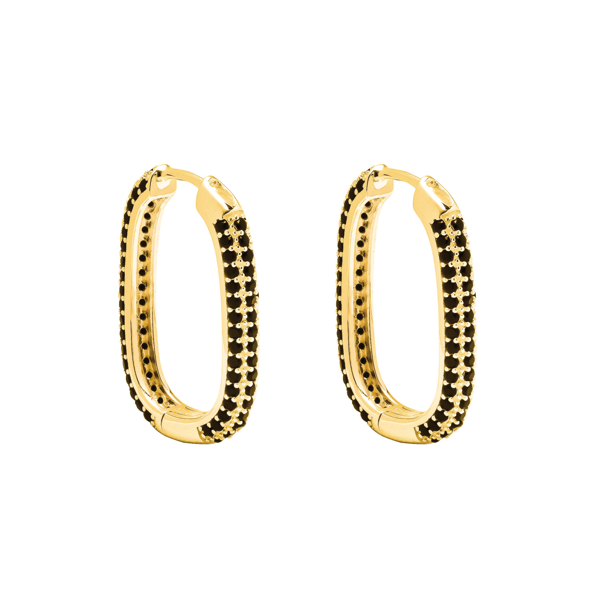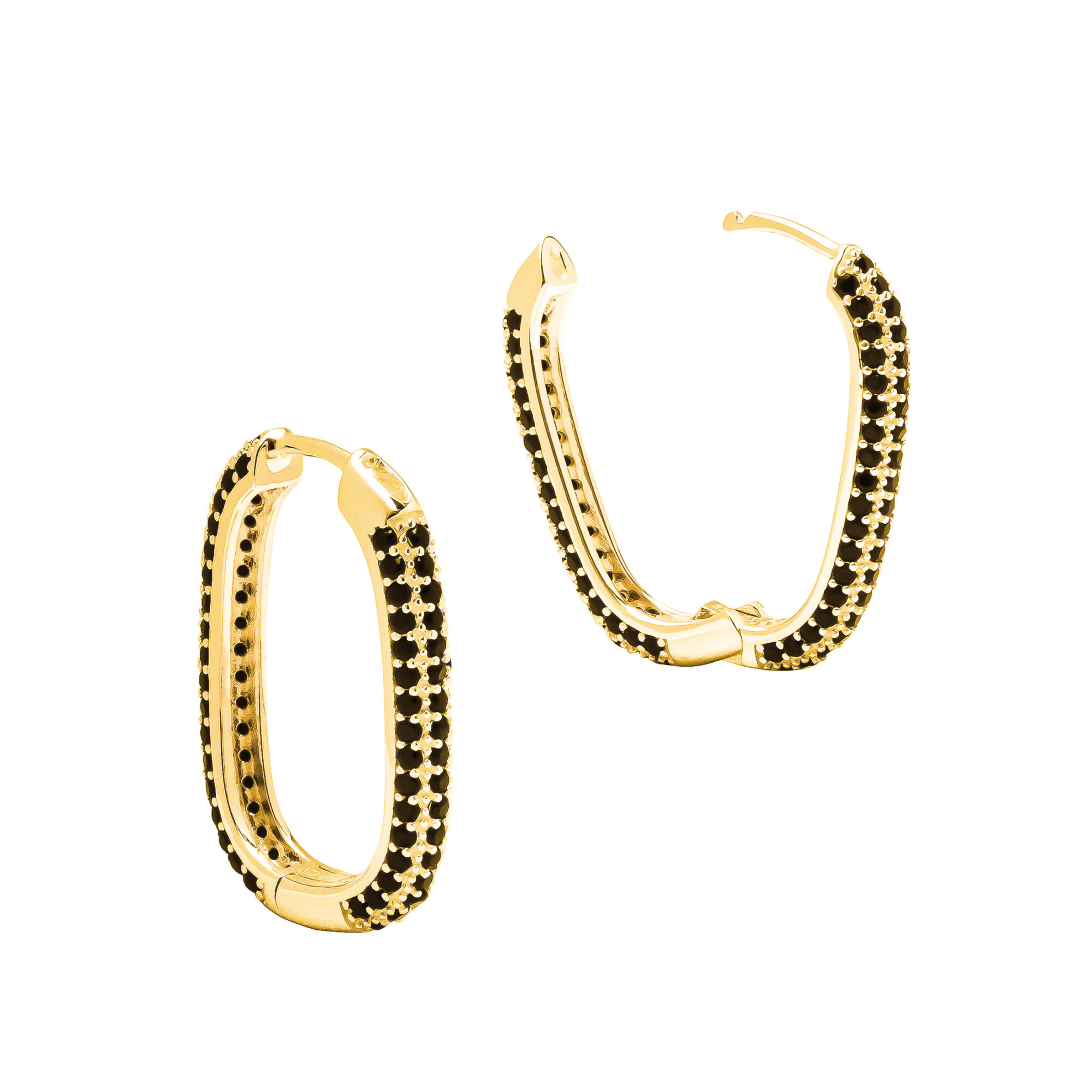These 18ct gold plated rectangular huggie hoops bring a bold and modern edge to your jewellery collection. Featuring sleek micro-set black cubic zirconia stones, the contrast with the radiant gold plating creates a striking and sophisticated look. The contemporary rectangular design and secure huggie fit offer both comfort and style, making them ideal for everyday wear or special occasions. Whether worn solo for subtle impact or layered for added drama, these hoops are a chic and versatile accessory with undeniable allure.