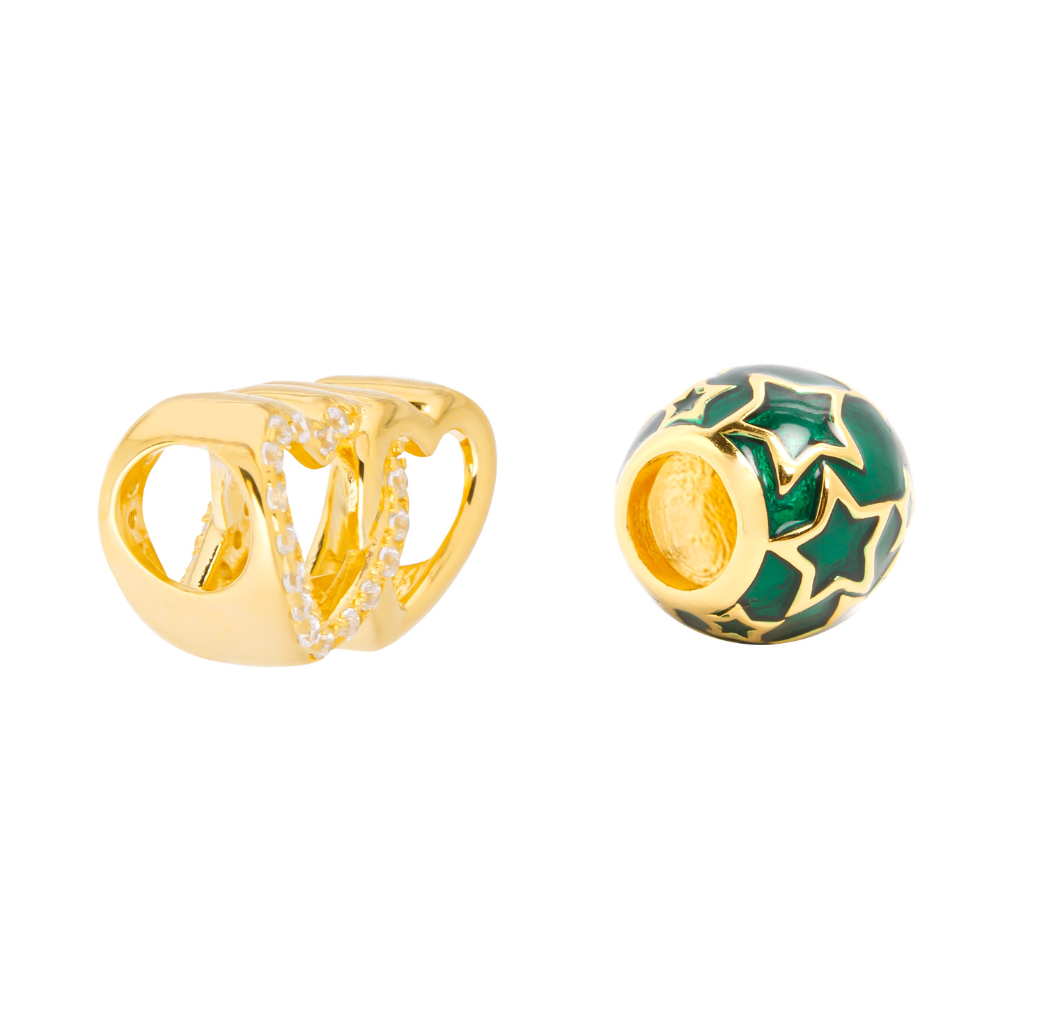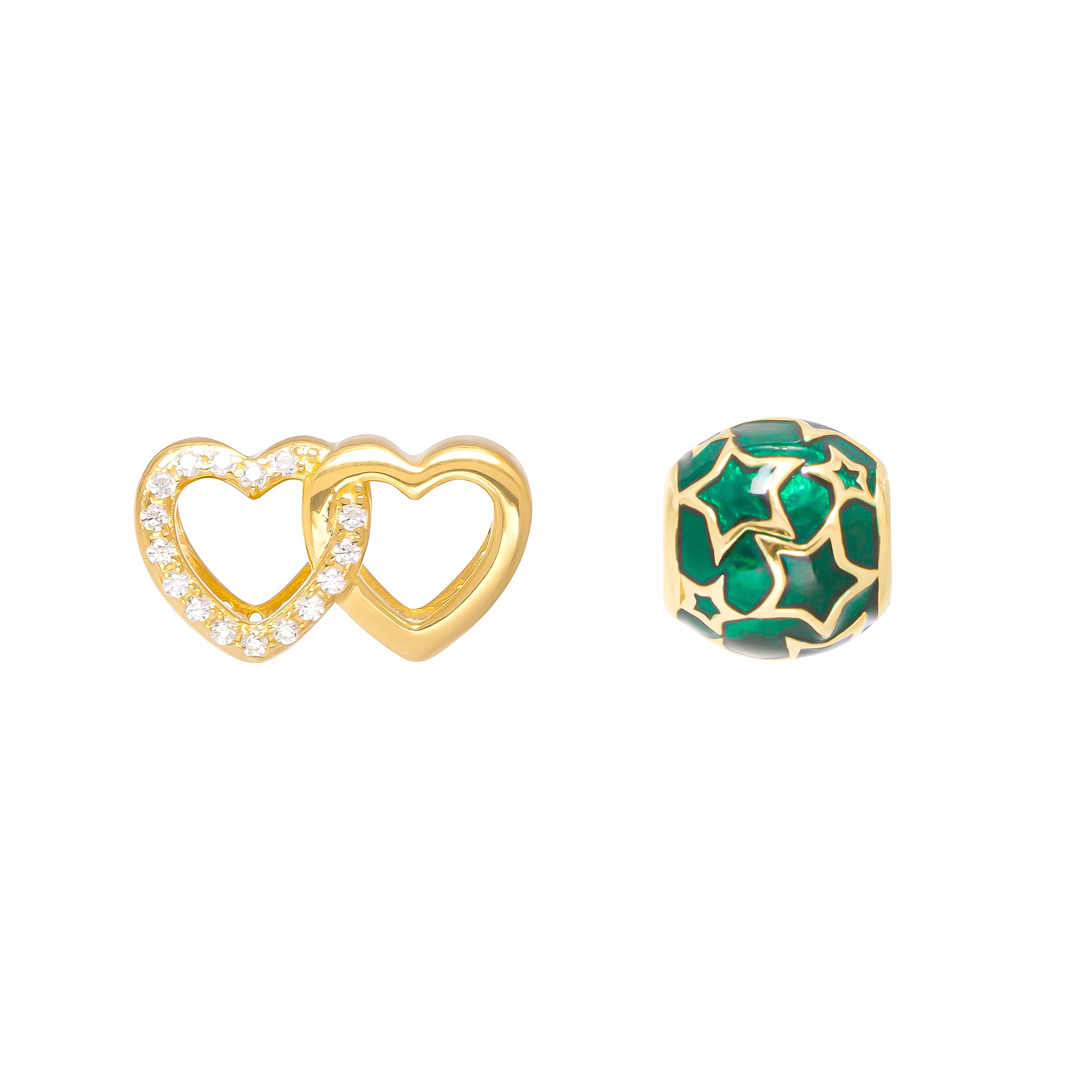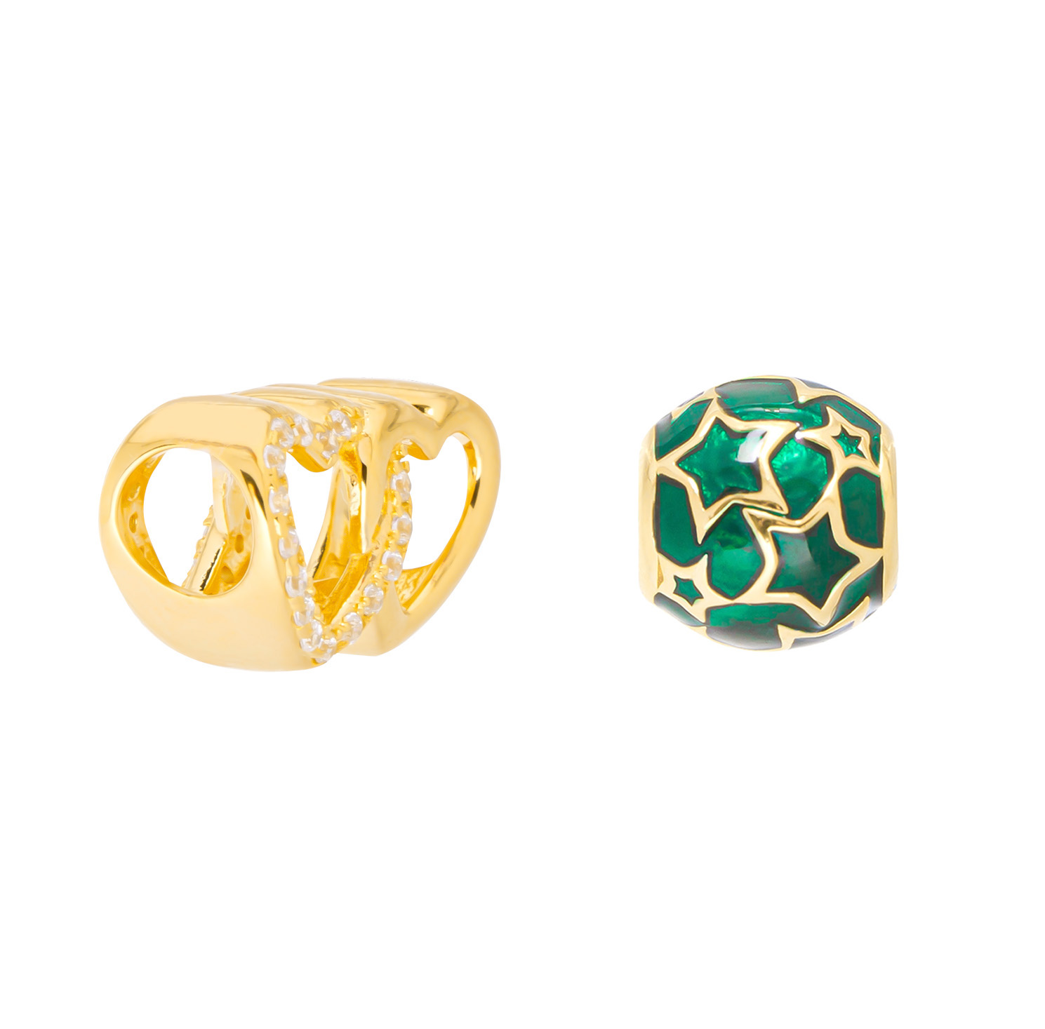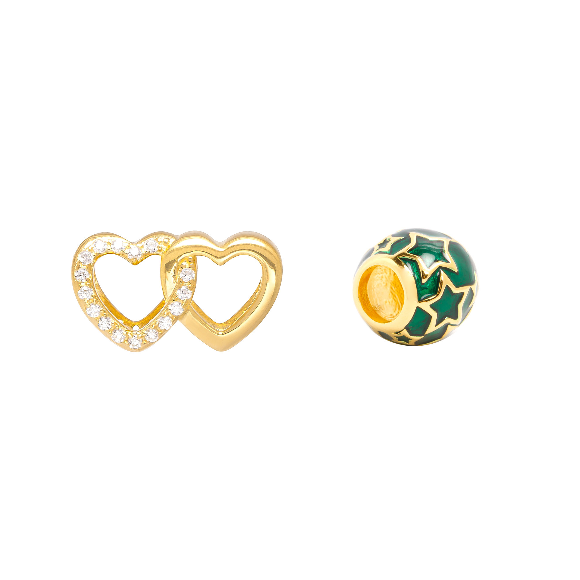 This item is a set of two 18ct gold plated sterling silver slider charms ideal for someone building their charm collection. One charm is a double heart with CZ detail and the other is a pretty star constellation slider charm with green enamel detail. Both slide on to a charm bracelet. Presented in a lovely box these items are perfect for gifting. Bracelet not included.