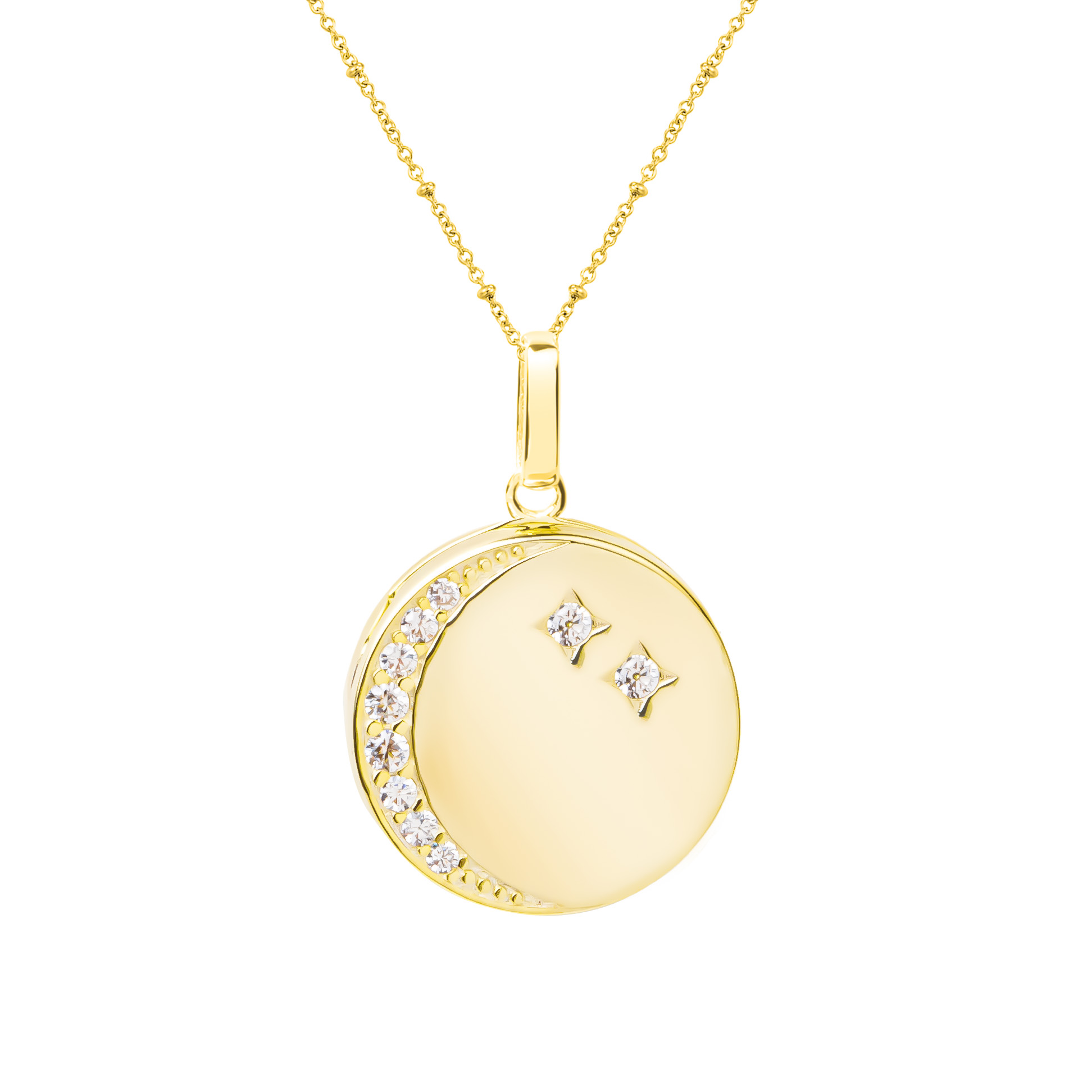 This modern moon and stars constellation cubic zirconia locket is made from sterling silver and is plated in 18ct gold for a luxurious look. The locket comes on an adjustable 16+2 inch sterling silver chain which is also plated in 18ct gold and coming in a lovely gift makes this necklace an ideal present for someone special.
