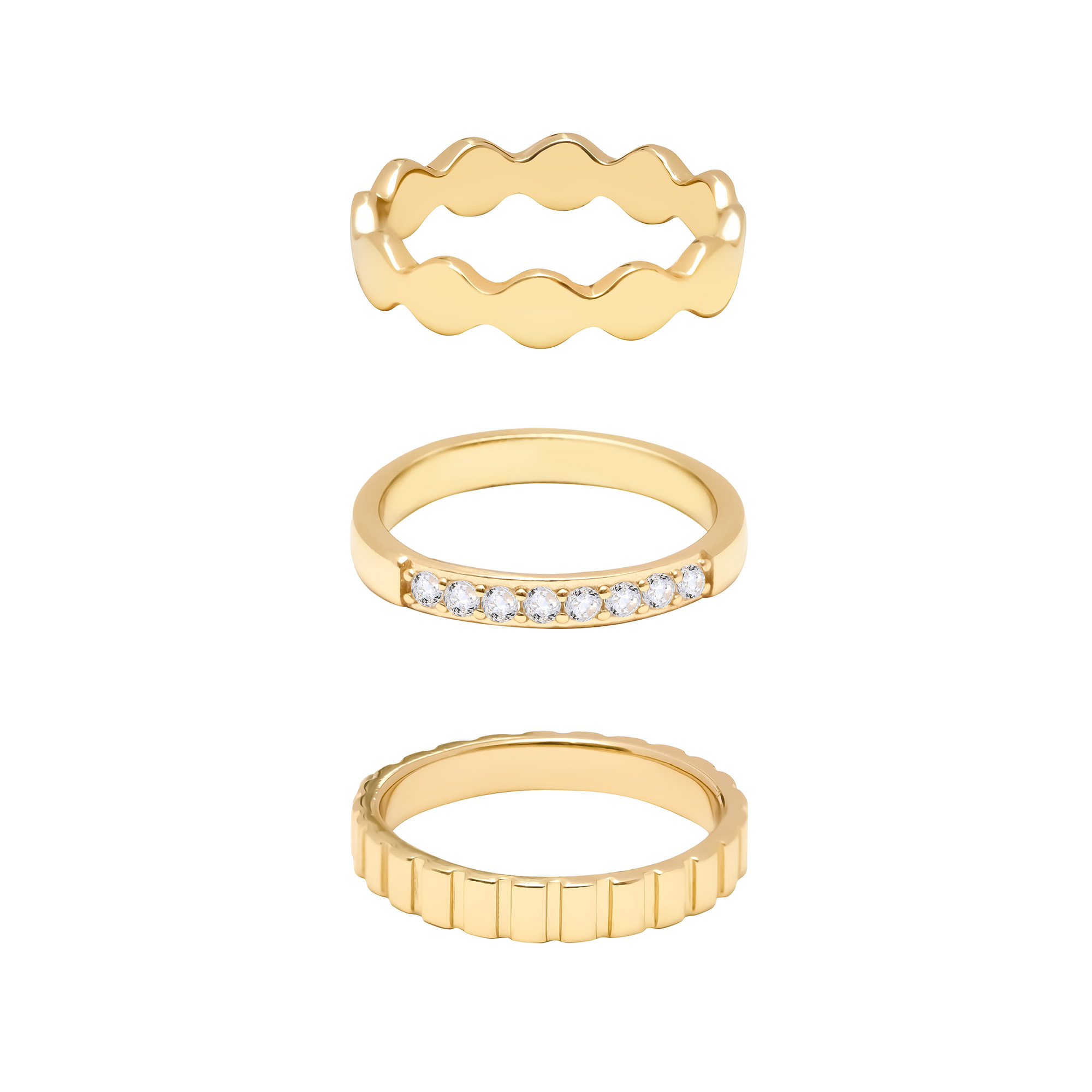 • This ring set features cute shiny cubic zirconias, a bobble style ring and a ribbed ring.