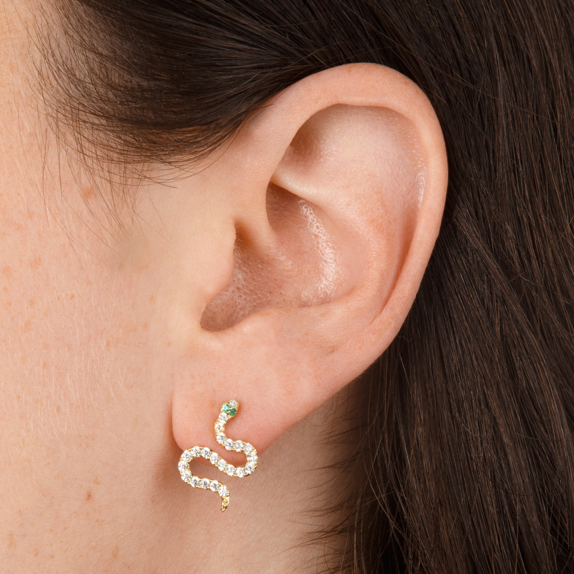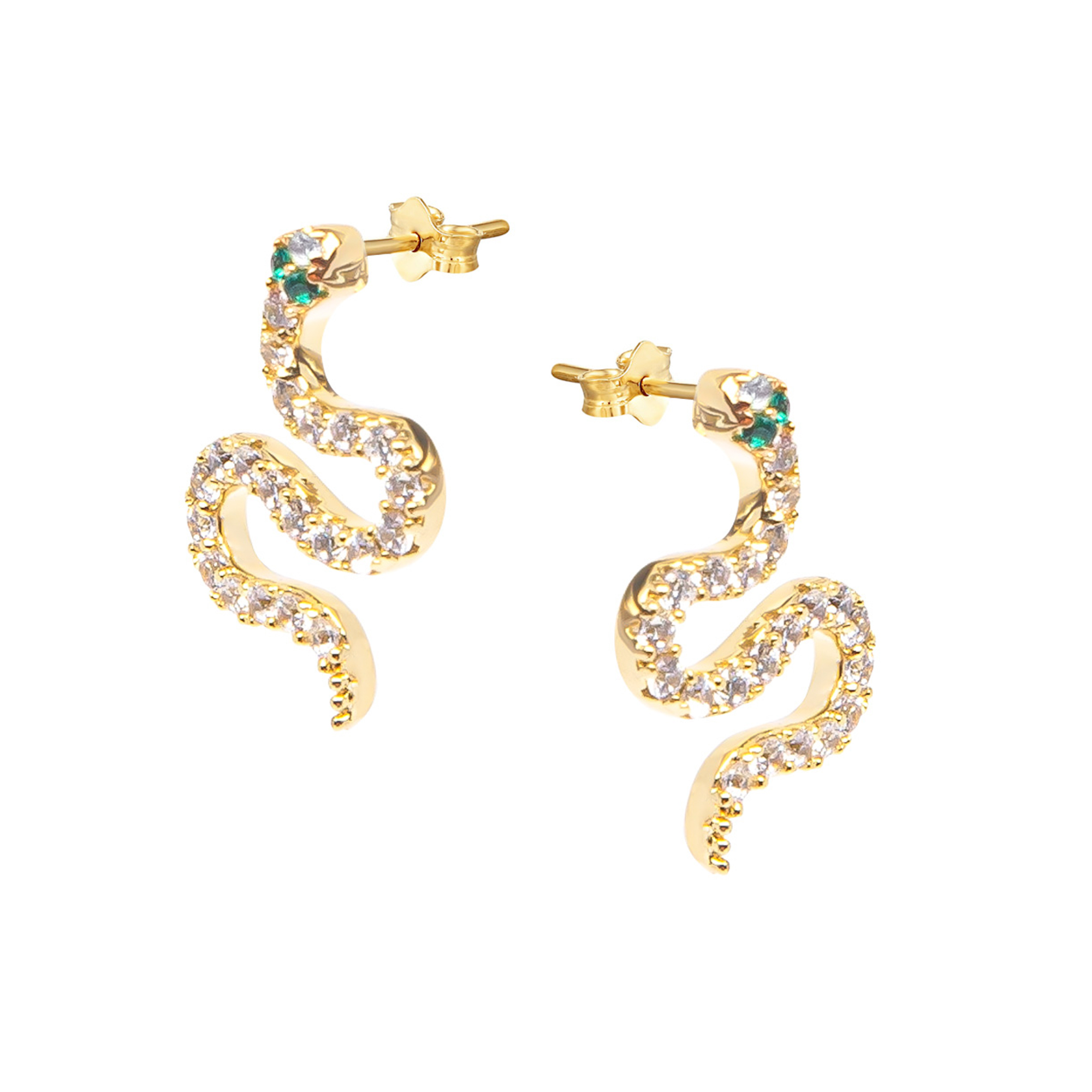 On-trend serpent style. This pair of studs is set with a row of cubic zirconia stones along the snake’s body, with two emerald coloured stones set where its eyes would go. These stud earrings are made from sterling silver and finished with an 18ct gold plating and the earrings are attached to the ear with 18ct gold plated sterling silver butterflies. Coming presented in a smart presentation box they are ideal for gifting.
