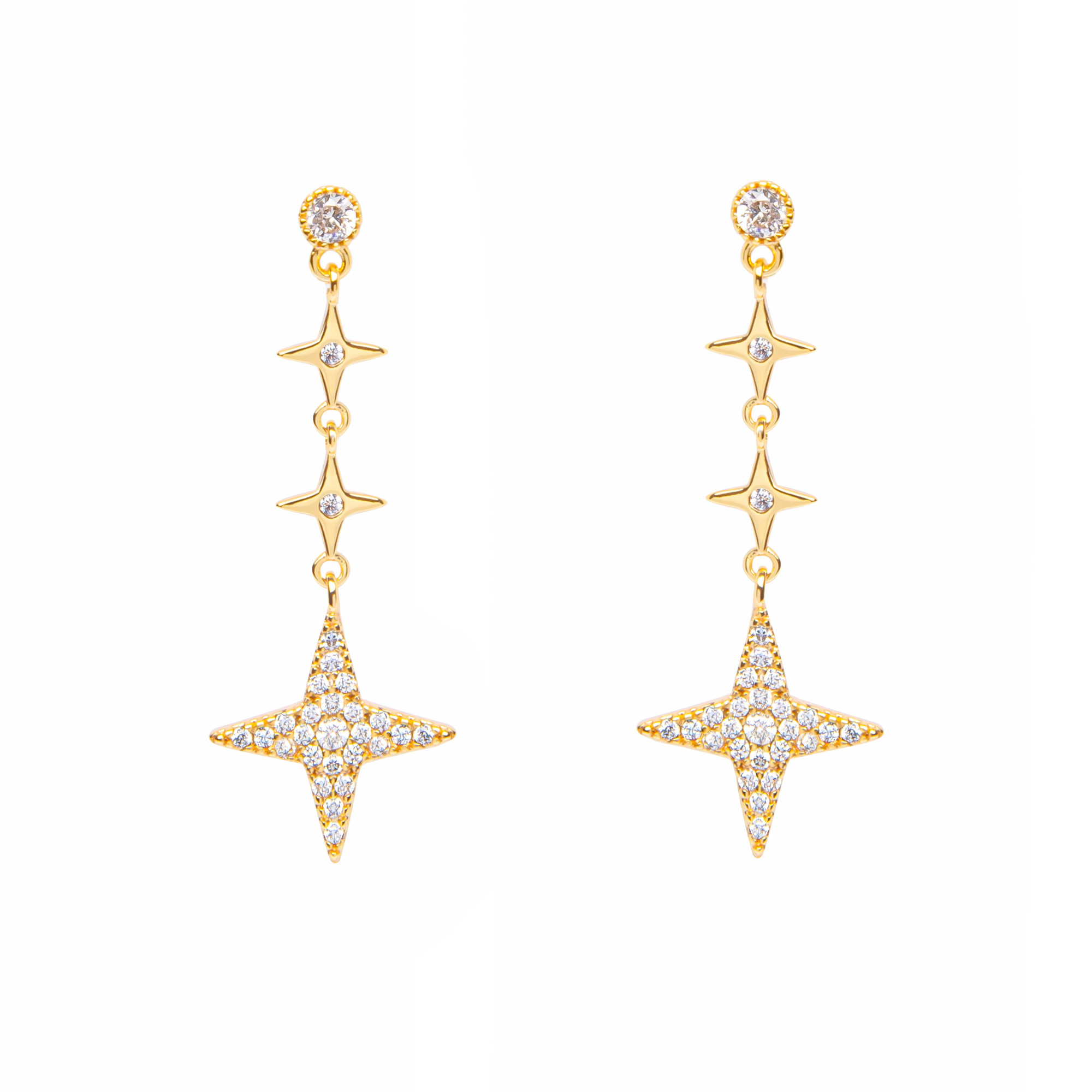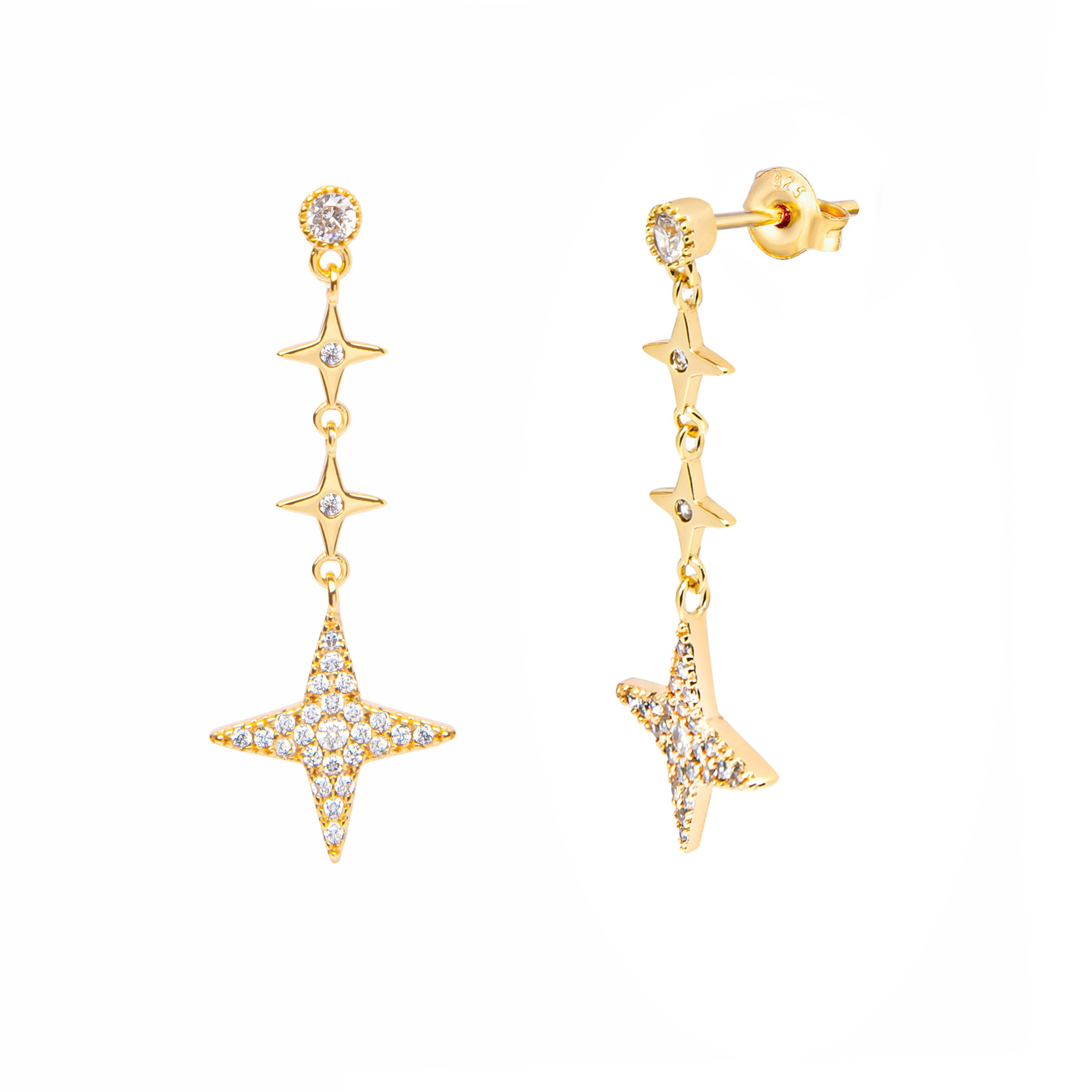 We love these party earrings! With the look gradually building as the earring drops, these earrings start with a solitaire cubic zirconia stone before slipping into a couple of a little cubic zirconia stars and finishing with a sparkly pav? set cubic zirconia star. The earrings are made from sterling silver and finished with 18ct gold plate to add to that luxury, party feel. Presented in a smart box ready for gifting.