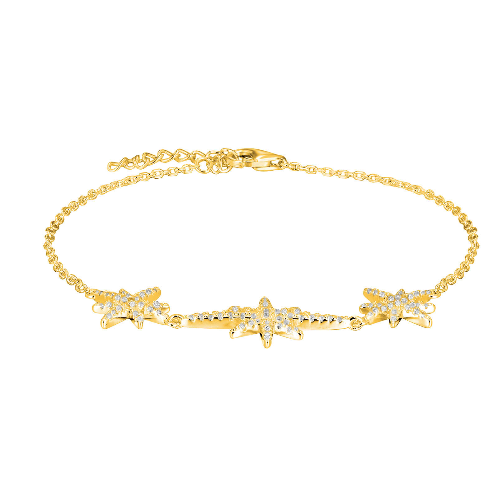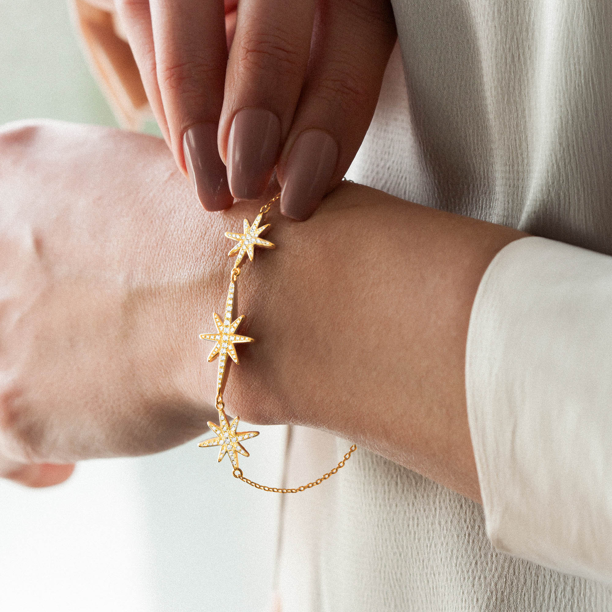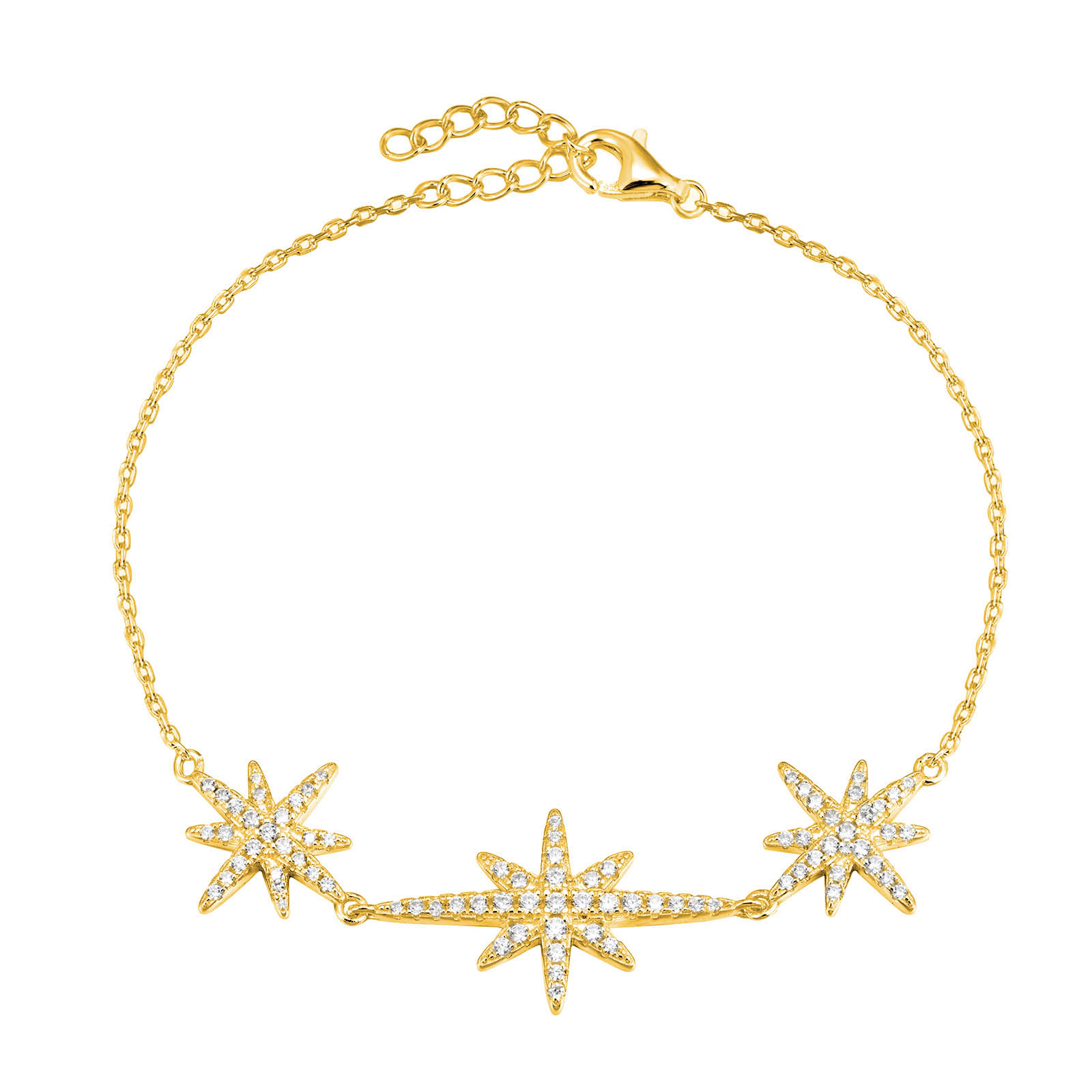 The 18ct Gold Plated Triple Star CZ Bracelet radiates British elegance and sophisticated charm. Featuring three intricately designed stars adorned with sparkling cubic zirconia stones, this bracelet blends luxury with contemporary style. Its radiant gold plating adds a glamorous glow, elevating any outfit with timeless craftsmanship and understated beauty. Perfect for adding a touch of refined sparkle to any occasion.