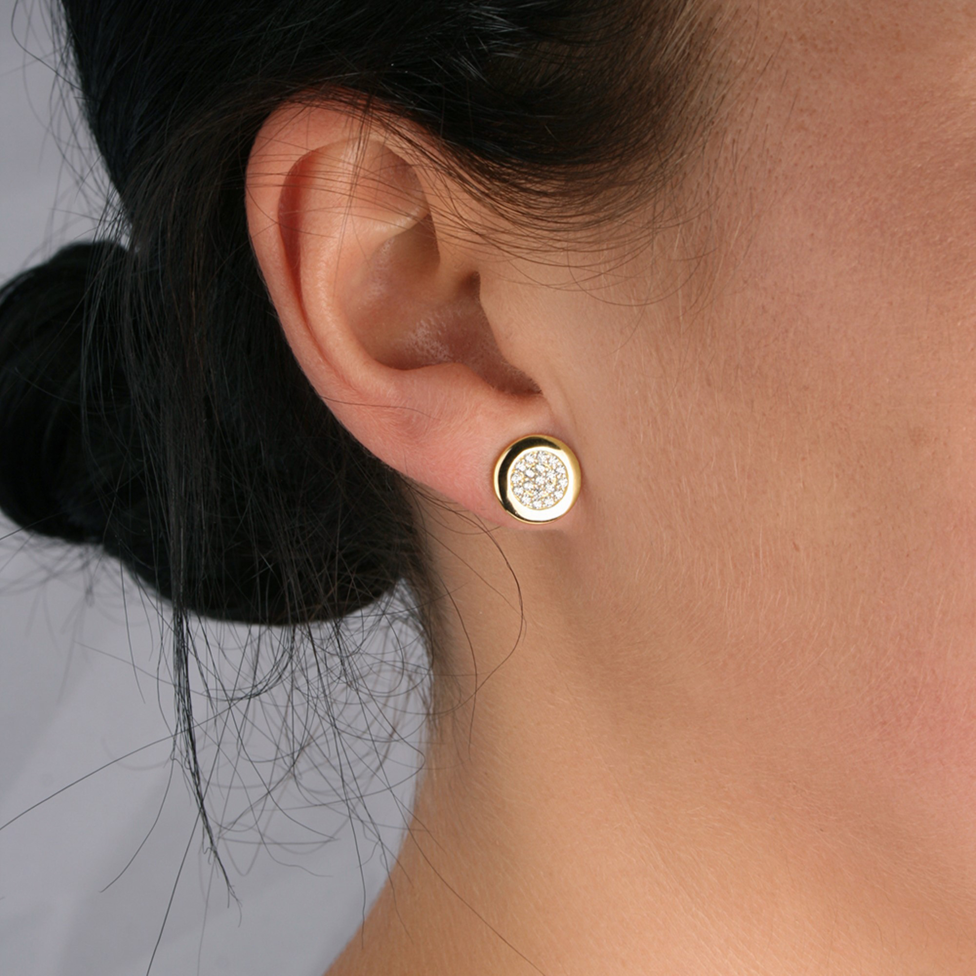 Beautiful pave set cubic zirconia earrings to bring a touch of glamour to any outfit, day or night. Set with sparkling cz stones, the earrings are sterling silver with 18ct yellow gold plate. With a framed edge and pave zirconia middle, these elegant earrings will bring a stylish finishing touch to your look. The earrings will arrive in a gift box, perfect for someone special.Measures 11mm (w) x 11mm (h).Please note that if you are ordering more than one item that they will arrive in only one gift box. If you need more than one gift box then please message us and let us know!