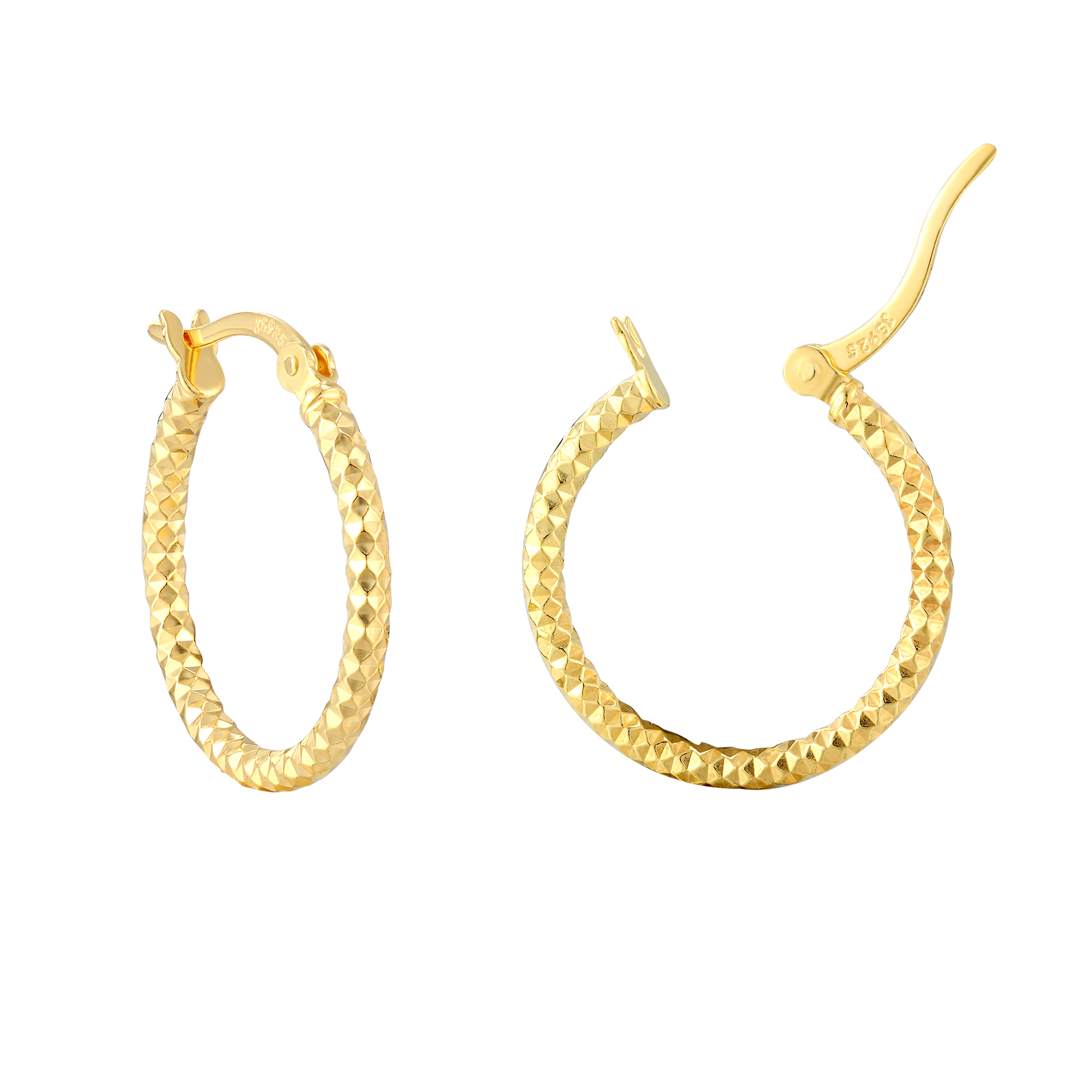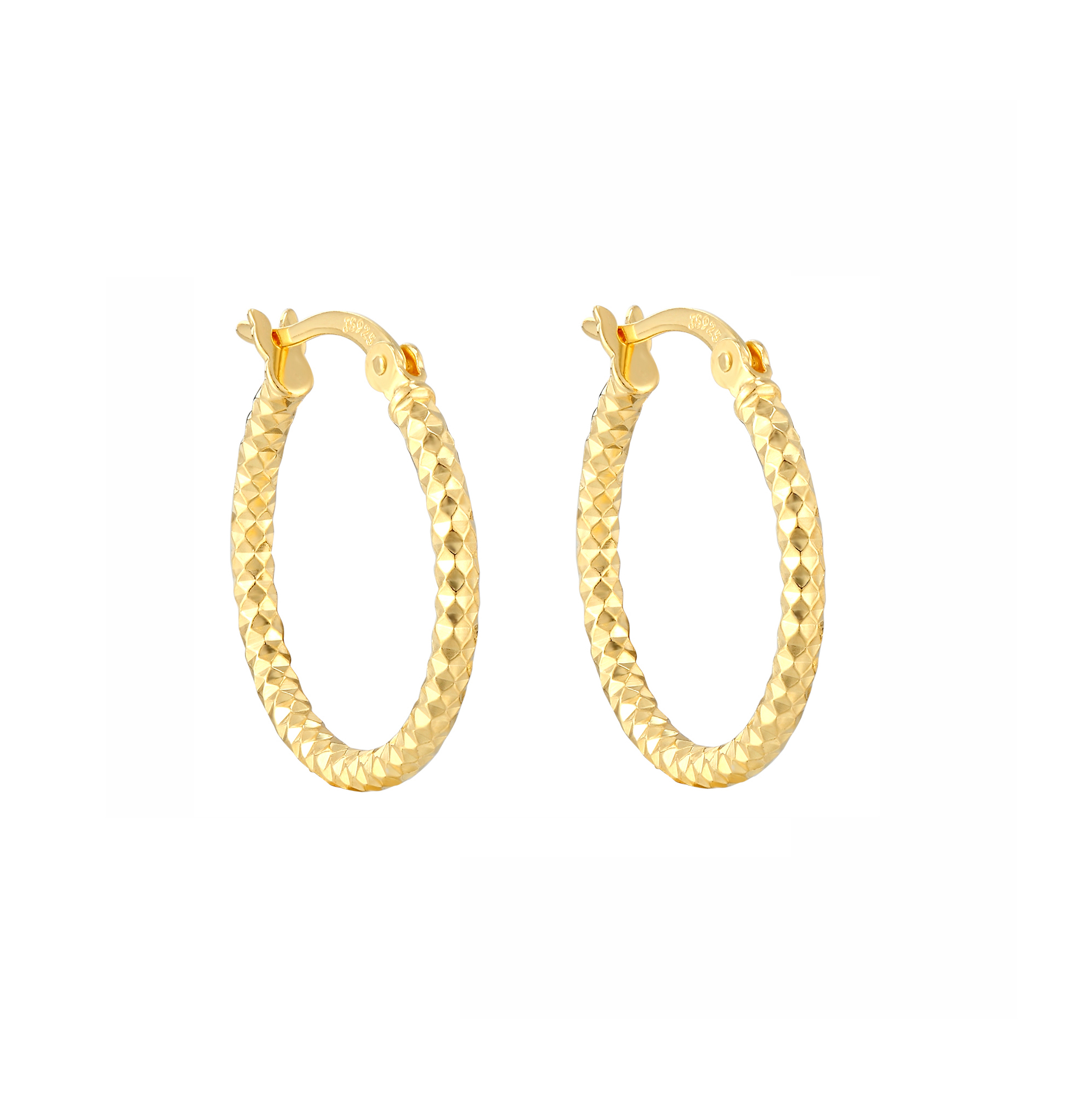 • These dainty 20mm creole hoops exude elegance and charm with their delicate diamond-cut design. Expertly crafted from high-quality sterling silver and plated with 18ct gold, these hoops offer a luxurious and radiant aesthetic. The diamond-cut pattern adds a subtle shimmer and texture, creating a captivating play of light. With a diameter of 20mm, these hoops are perfectly sized to add a touch of sophistication to any outfit without overwhelming the overall look.