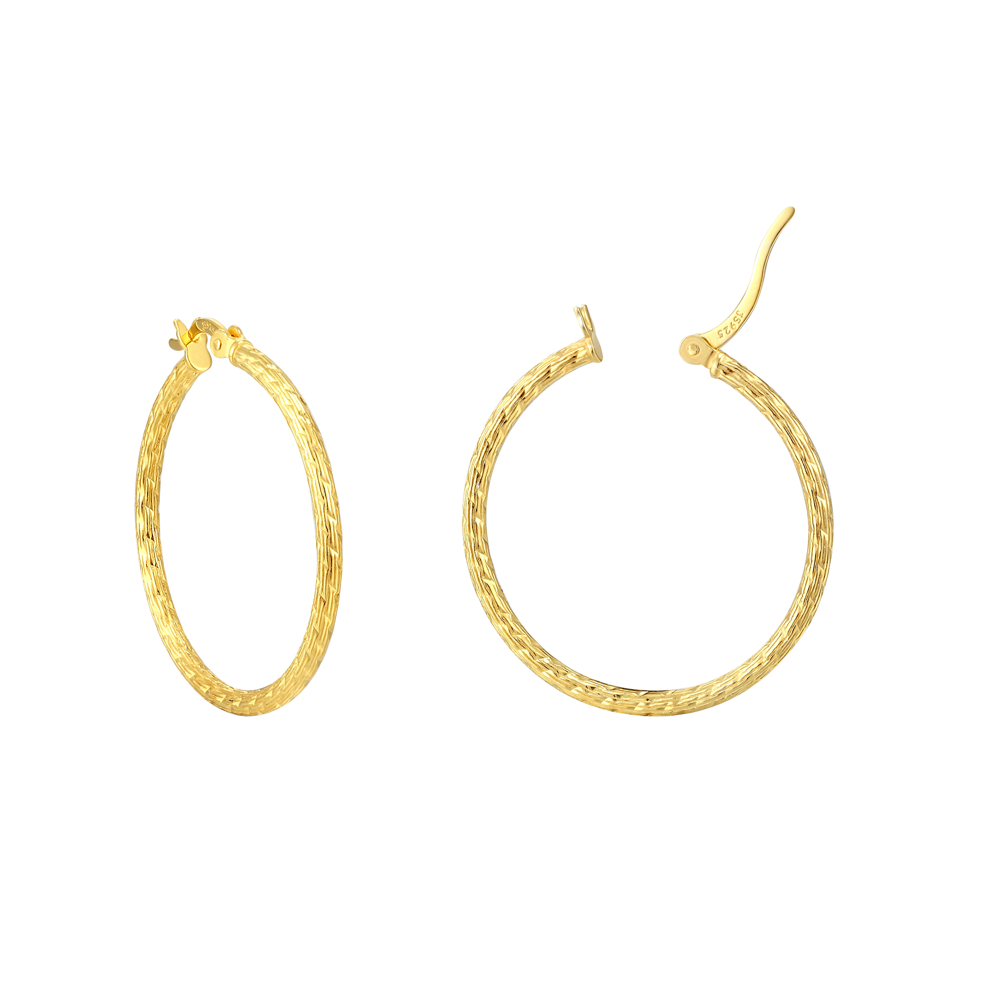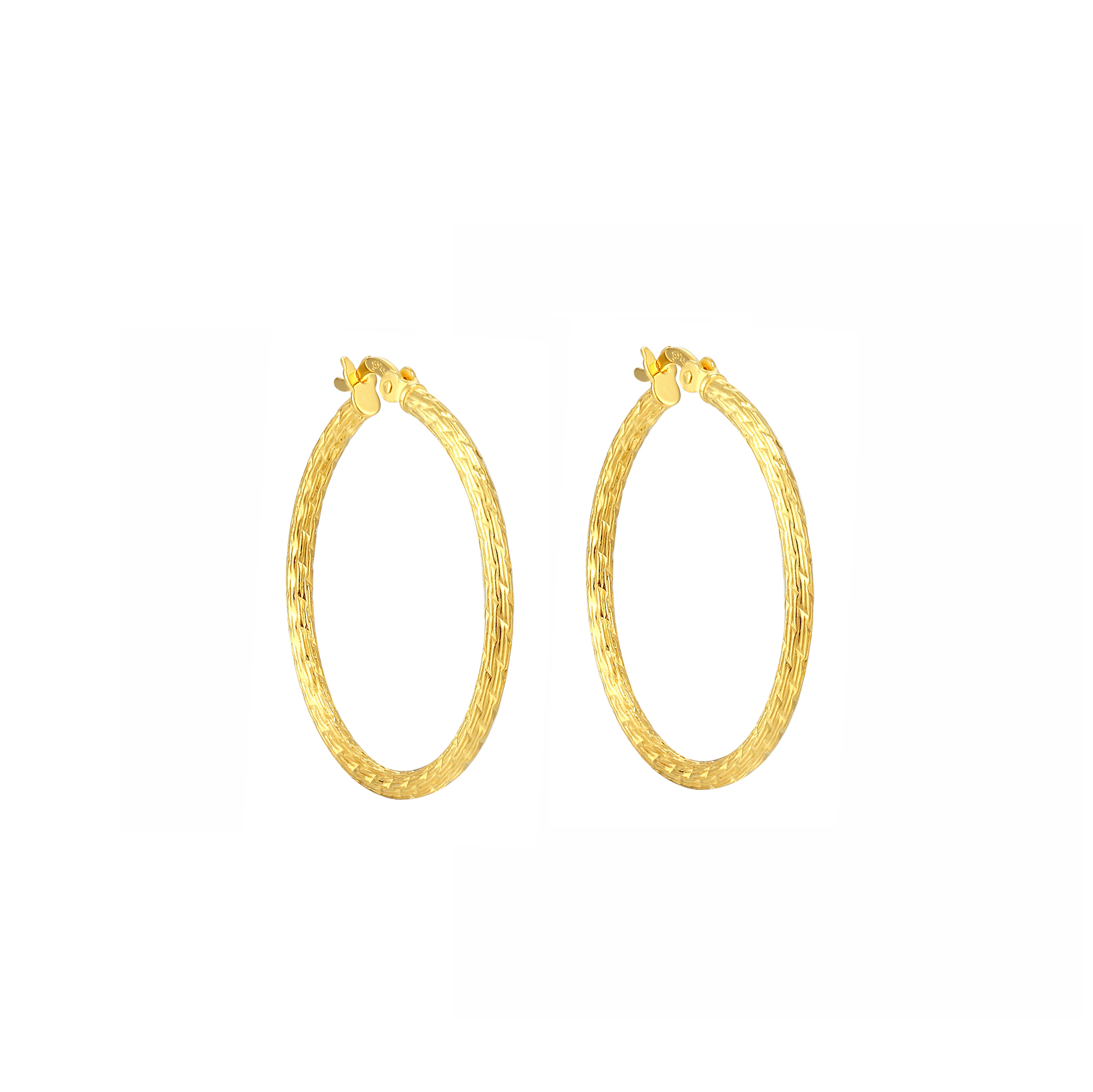 • These 30mm creole hoops offer a delicate and refined style with their dainty design. Crafted from high-quality sterling silver and plated with 18ct gold, these hoops radiate a luxurious and radiant appeal. The slender profile and understated elegance make them versatile for various occasions, from casual outings to more formal events. With a diameter of 30mm, these hoops strike a balance between being noticeable and lightweight, allowing for comfortable wear throughout the day.