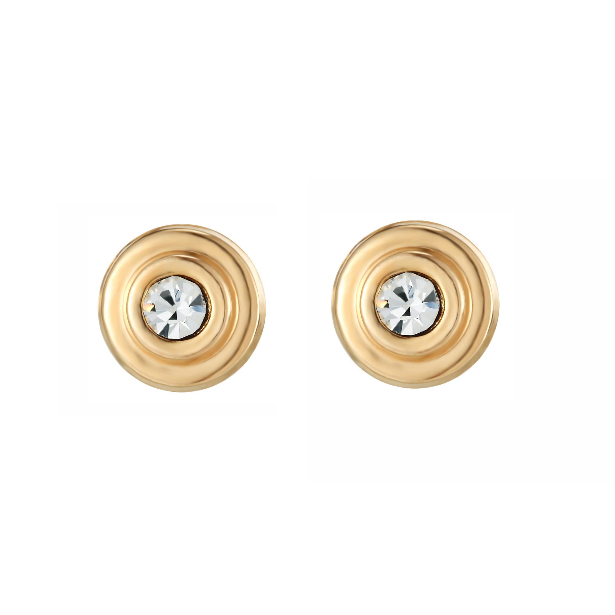 This pretty pair of round stud earrings is manufactured and hand-finished in the UK from 9ct yellow gold and they fasten behind the ear with butterflies. Deep stamped, to give the look of a heavy, expensive earring, these circular studs have a pretty crystal centre to add a sparkling finish to an outfit. The earrings come in a presentation box, making them the ideal gift for someone special.8mm (w) x 8mm (h)
