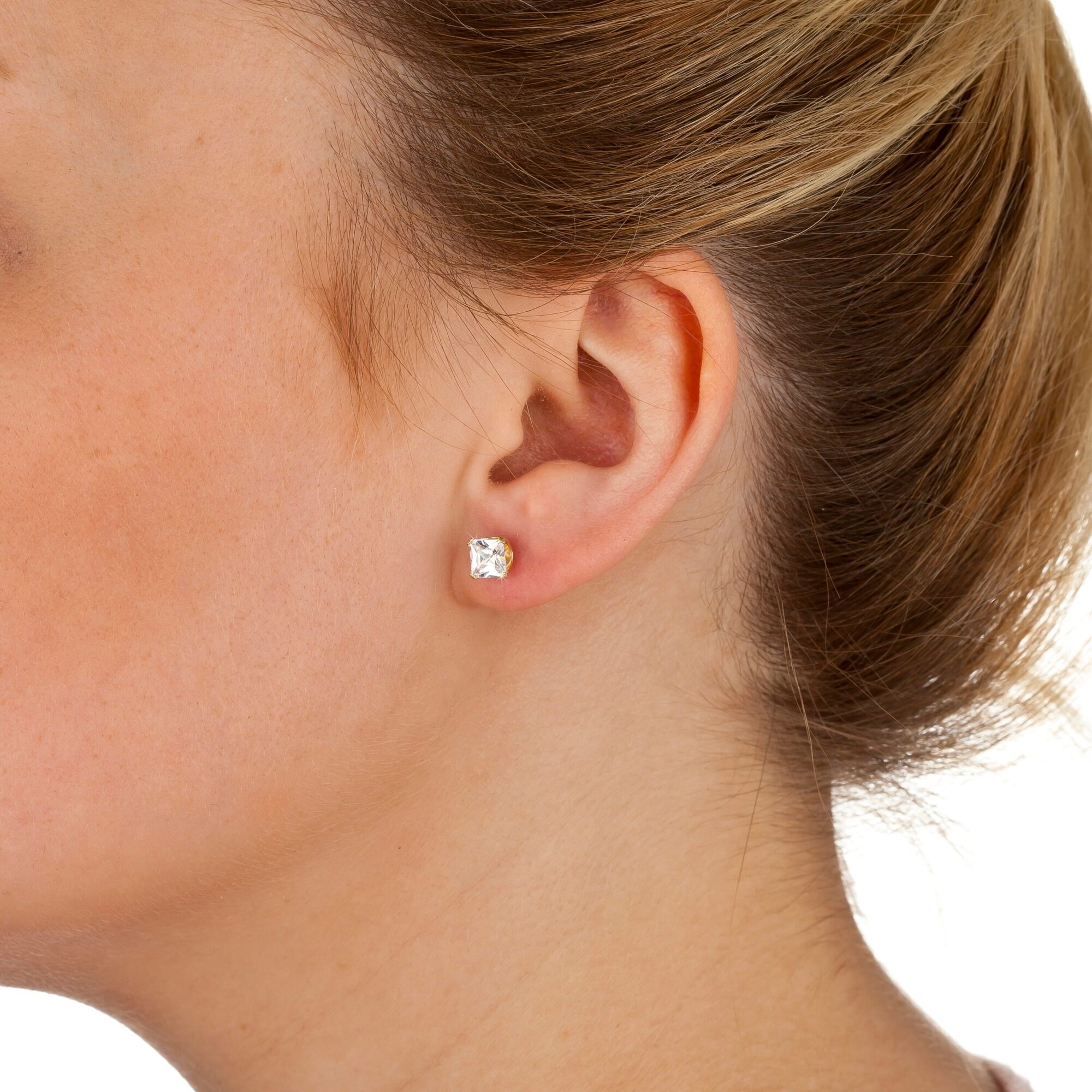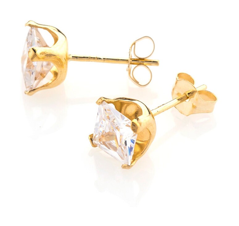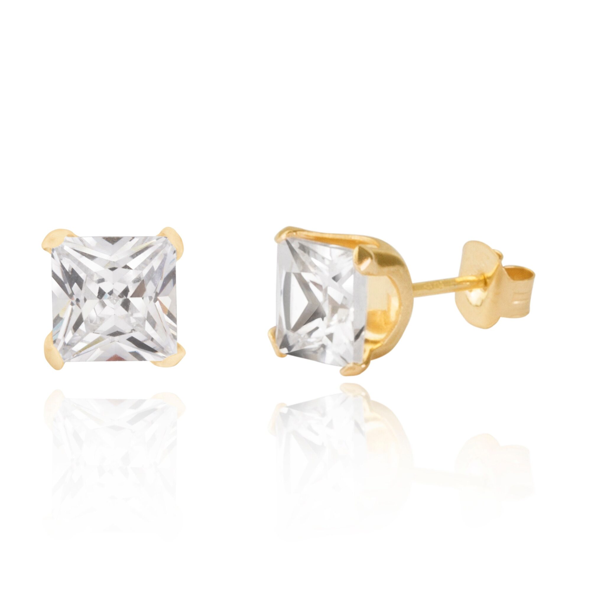 This beautiful pair of classic stud earrings is manufactured and hand-finished in the UK from 9ct yellow gold and they fasten behind the ear with butterflies. With a 5mm square princess cut white cubic zirconia stone set at its four corners, these earrings sparkle and look fabulous on! The earrings are presented in a small gift box and make the ideal gift for someone special.