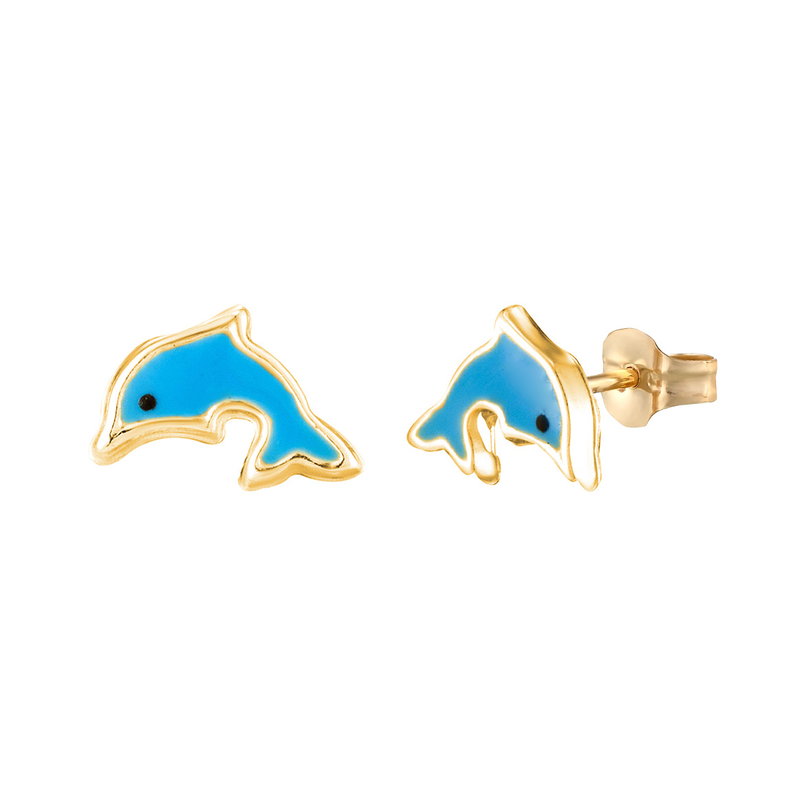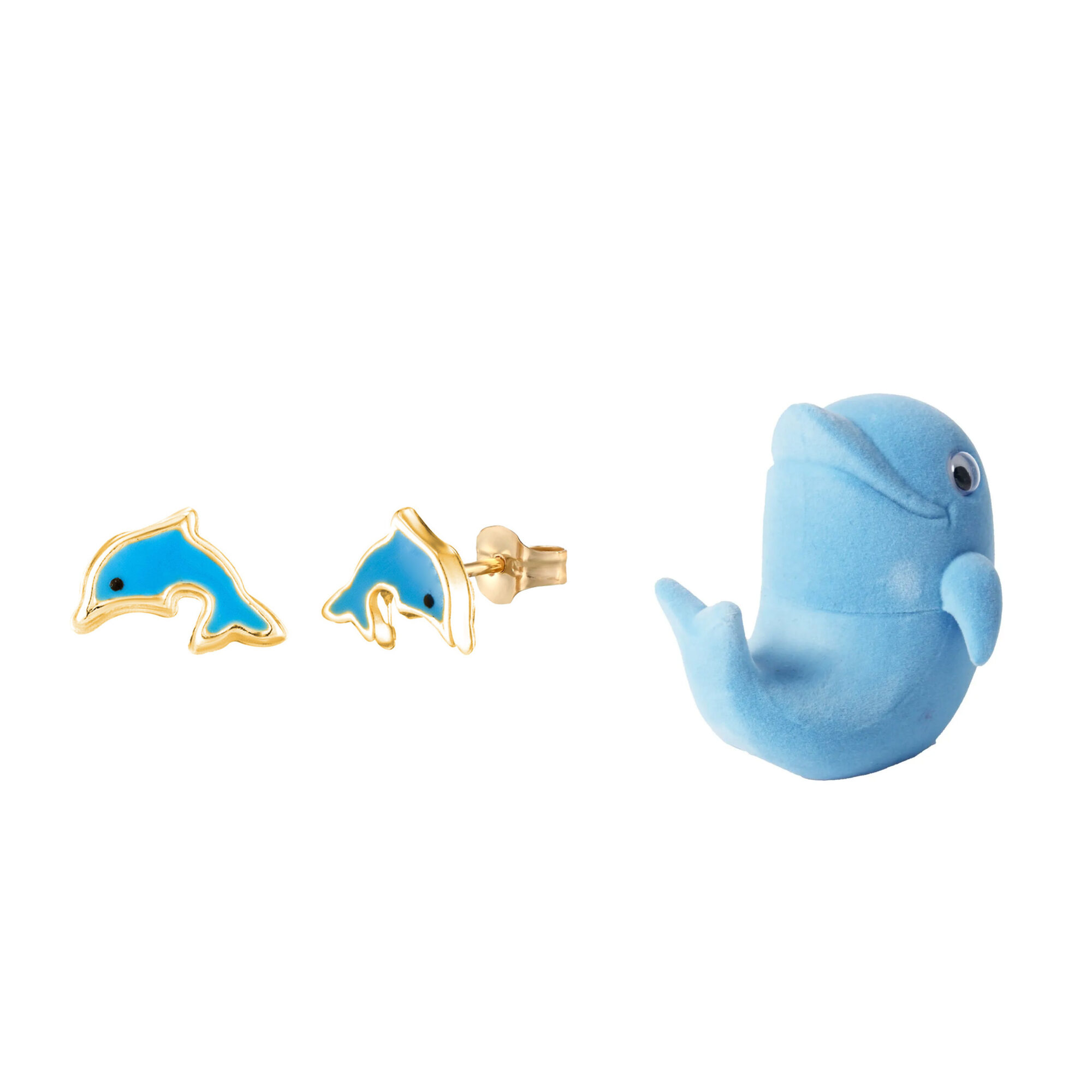 This cute pair of enamelled dolphin stud earrings is manufactured and hand-finished in the UK from 9ct yellow gold and they fasten behind the ear with butterflies. The dolphins are enamelled blue and come in a gorgeous novelty presentation box making them the ideal gift or stocking filler. these studs are available to purchase with or without novelty box.