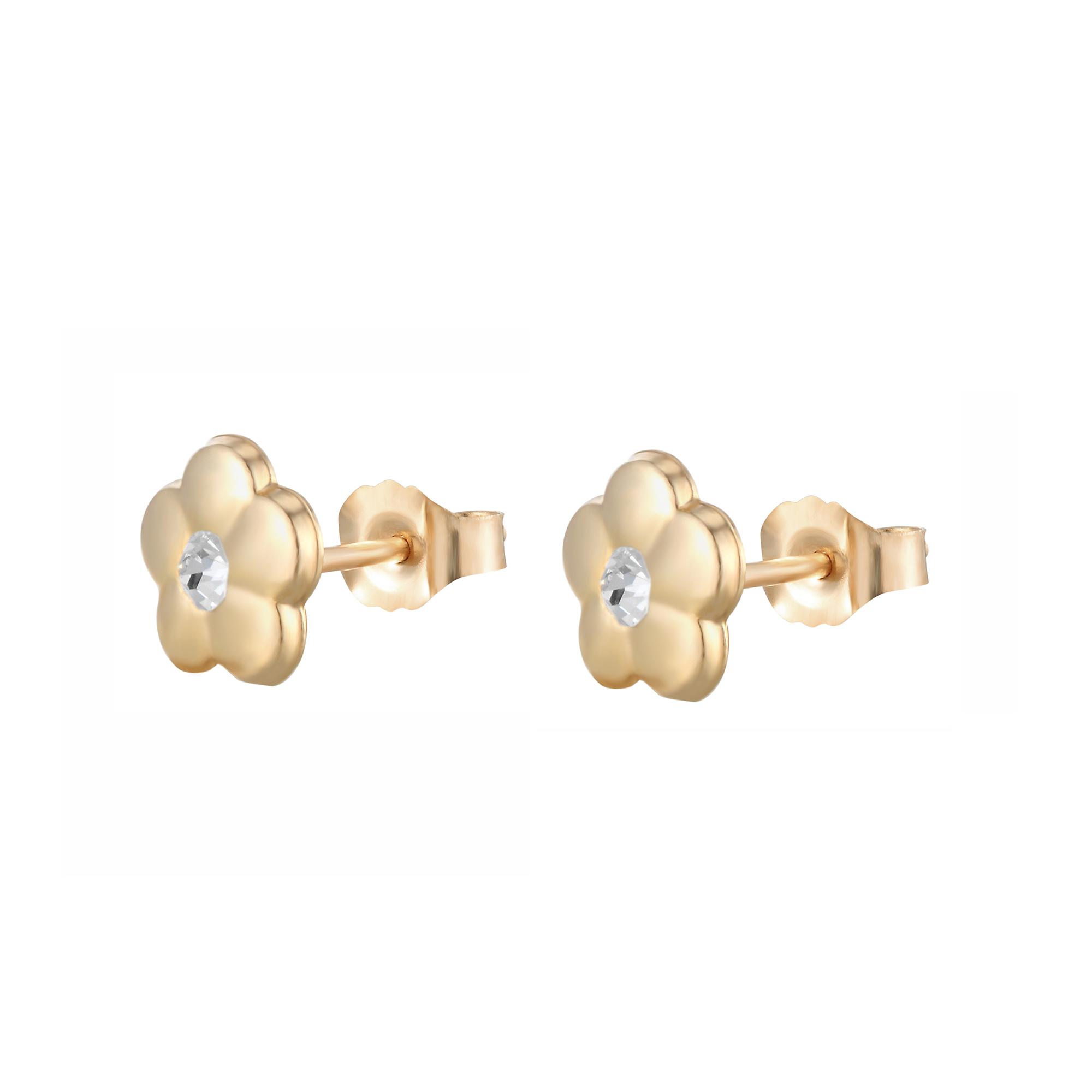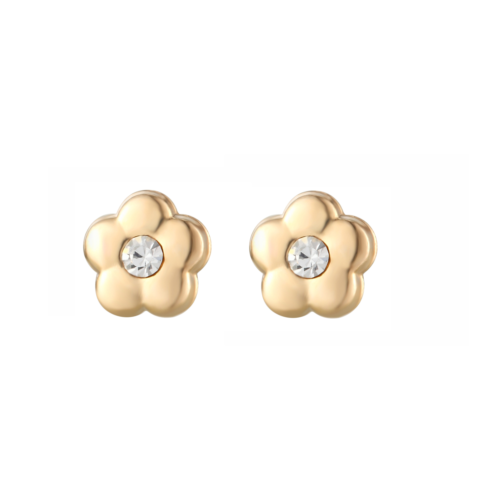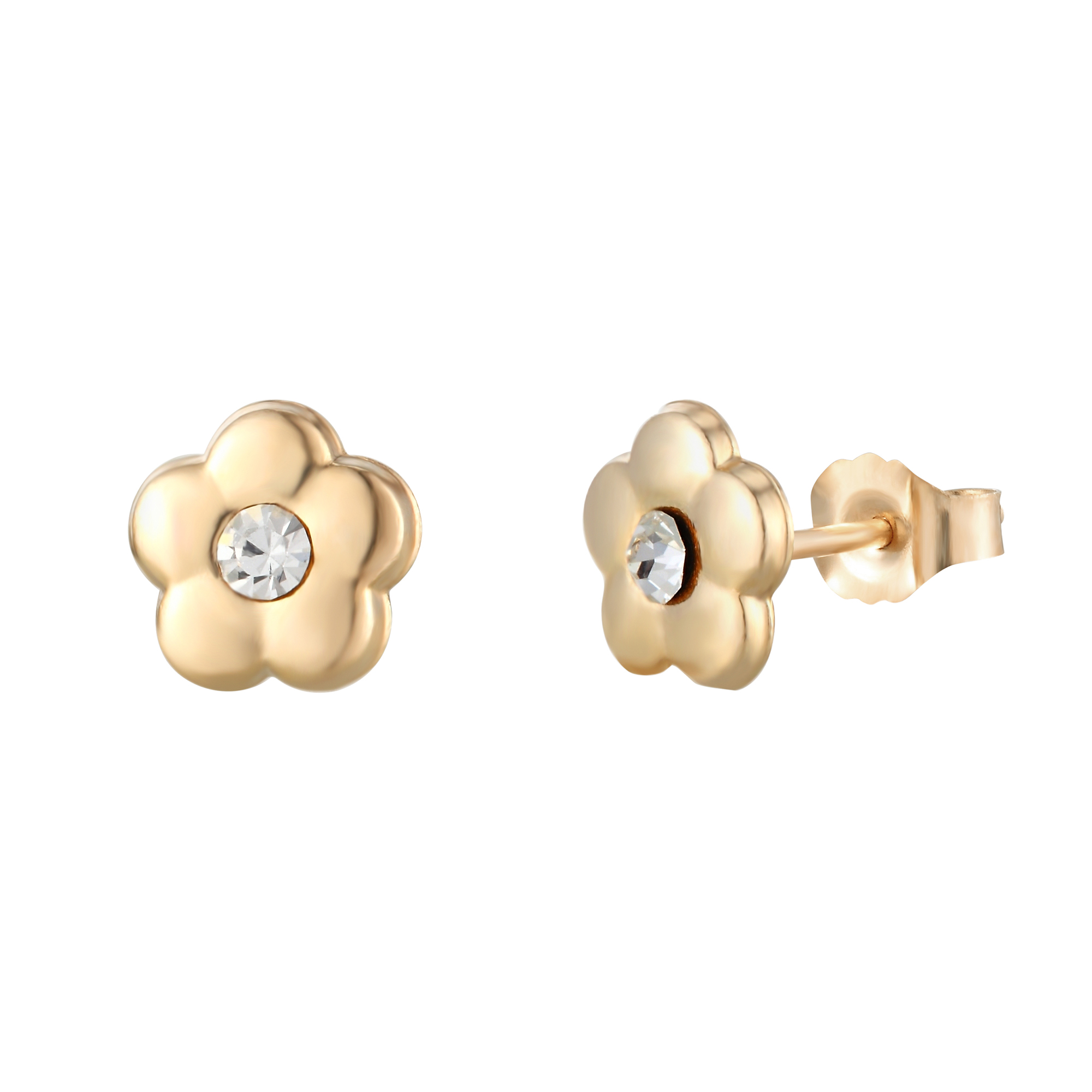 This cute pair of flower stud earrings is manufactured and hand-finished in the UK from 9ct yellow gold and they fasten behind the ear with butterflies. With a small round crystal set in the centre of the flower, these pretty earrings sparkle and look gorgeous! The earrings come in a beautiful presentation box and would make an ideal gift for someone special.