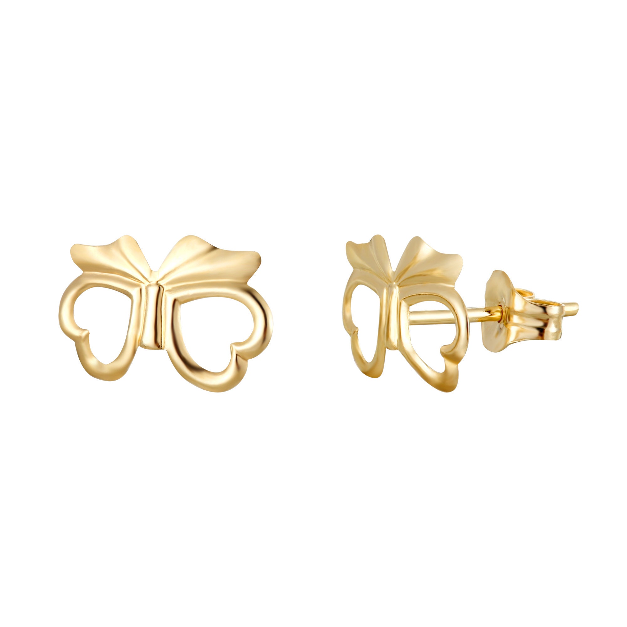 This gorgeous pair of bow stud earrings is manufactured and hand-finished in the UK from 9ct yellow gold and they fasten behind the ear with butterflies. With a heart in each bow, these stylish 9ct gold studs will add that subtle, elegant finish to a classy outfit. The earrings are supplied in a beautiful presentation box, making them the ideal gift for someone special.