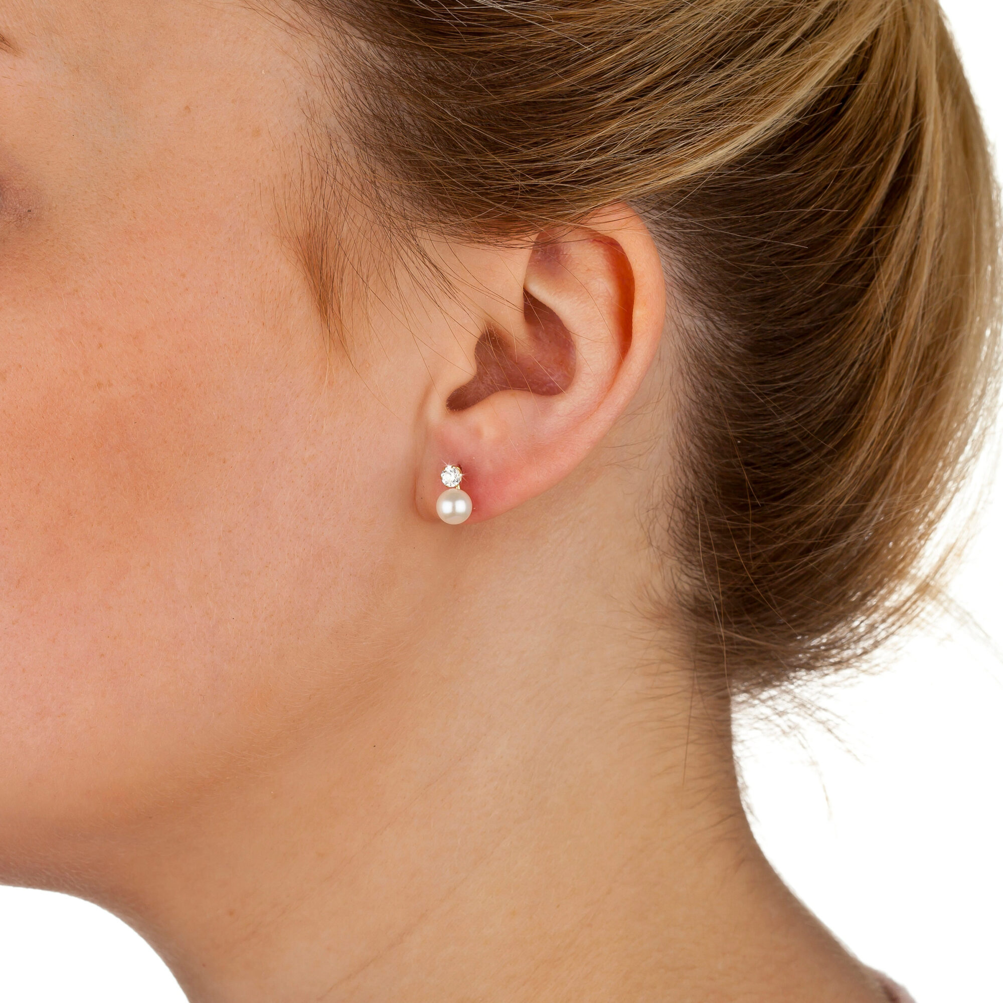 This beautiful pair of pearl and cubic zirconia earrings is manufactured and hand-finished in the UK from 9ct gold. With a sparkling white cubic zirconia stone set above a larger freshwater pearl, these classy earrings provide a gorgeous finish to an elegant outfit and would be ideal for matching bride and bridesmaids jewellery. All our earrings are presented in a pretty gift box, making the ideal gift for someone special.Available in 9ct yellow gold or 9ct white gold.Measures 5mm (w) x 9mm (h).Please note that if you are ordering more than one item that they will arrive in only one gift box. If you need more than one gift box then please message us and let us know!