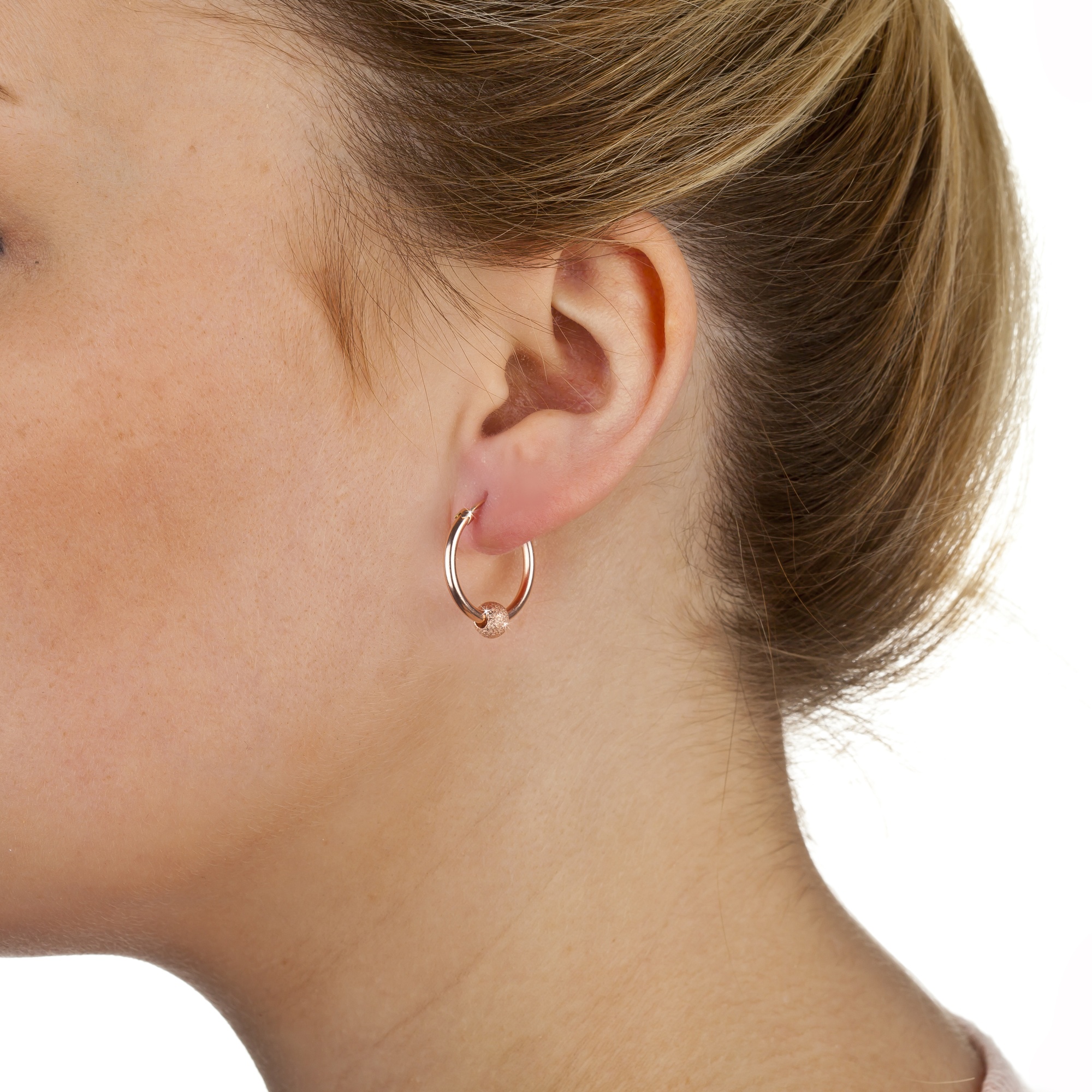 Handmade in the UK, these understated hoops measure a delicate 18 mm in diameter. Choose from yellow gold, rose gold or white gold, each earring features a matching frosted bead that adds a glamorous twist to the simple style of these hoops. Presented in a lovely presentation box, these beautiful earrings would make a lovely present for any special occasion.