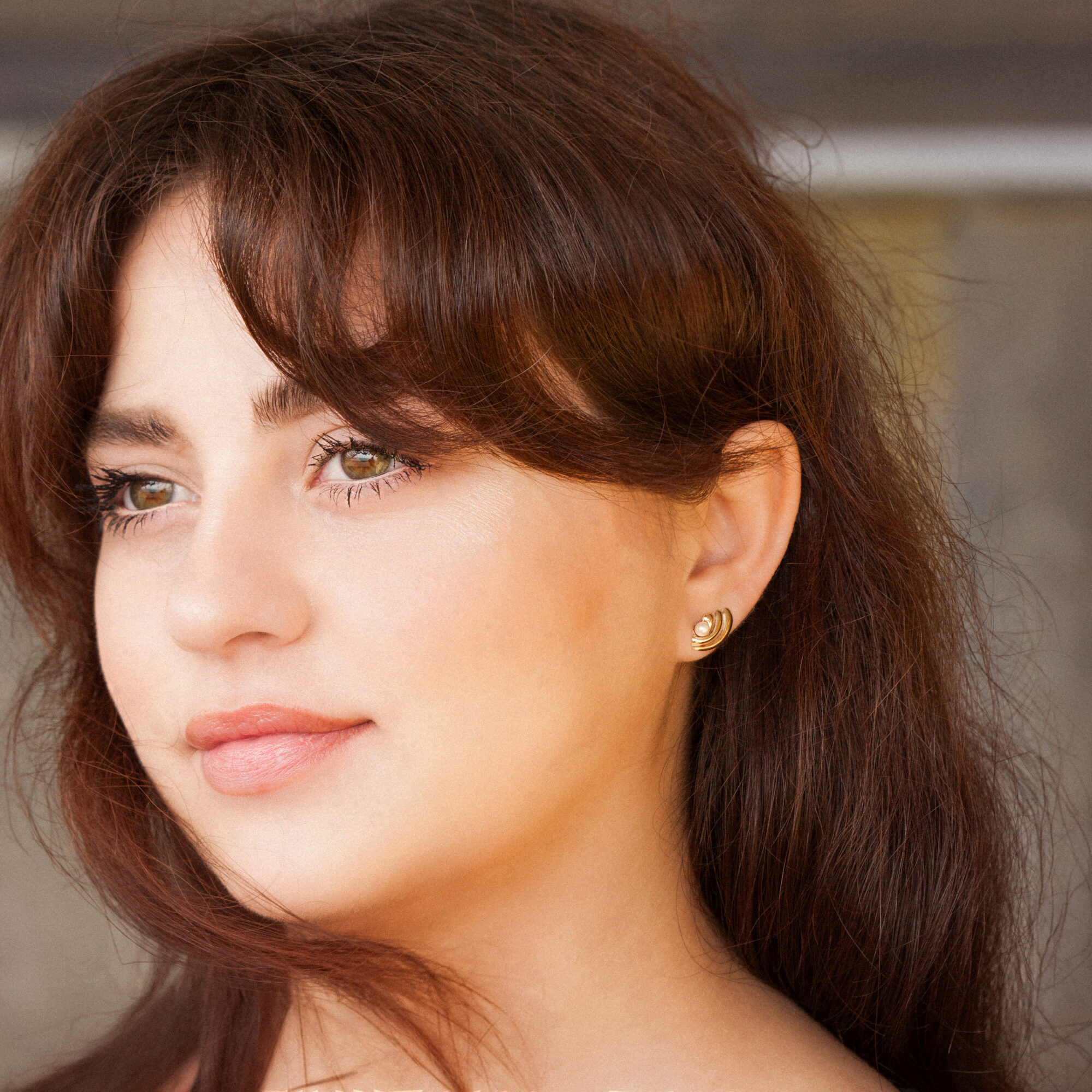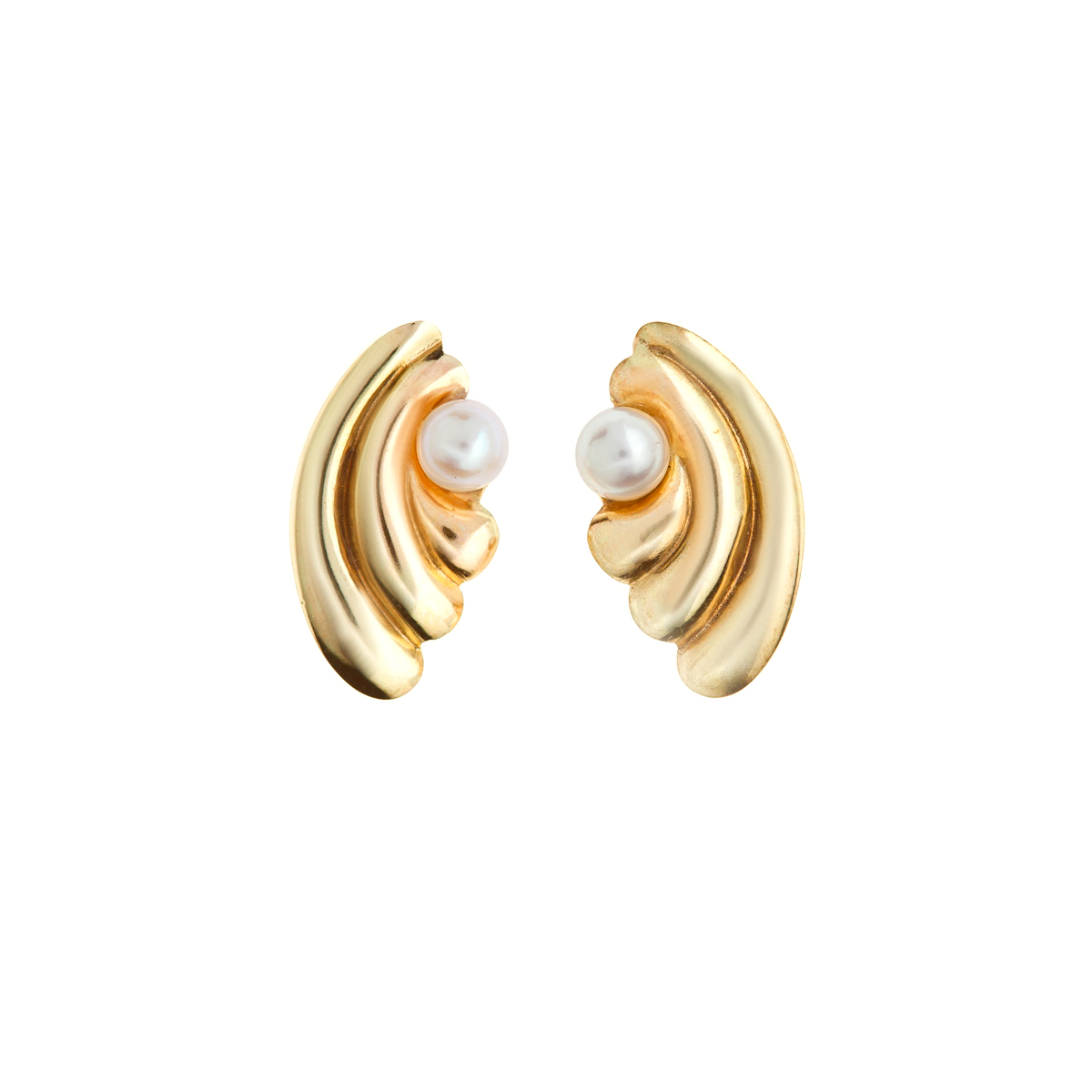 These contemporary pearl studs are handmade in the UK from 9ct yellow gold. Measuring 9mm x 15mm, these earrings are set elegantly with 3.5mm cultured pearls amongst three sweeping arcs – the perfect statement piece. These earrings will arrive in a fine linen box, great to give to someone special.