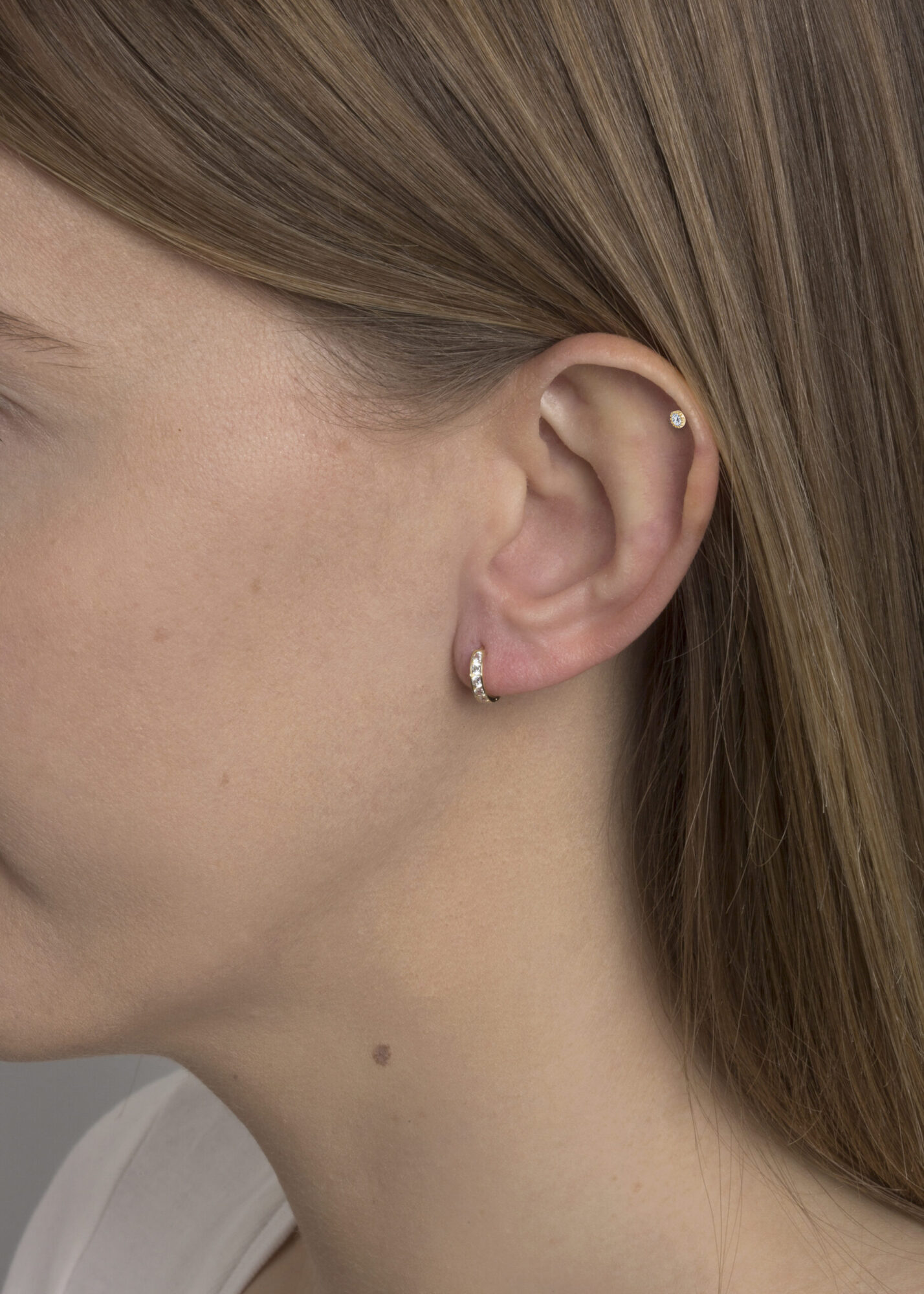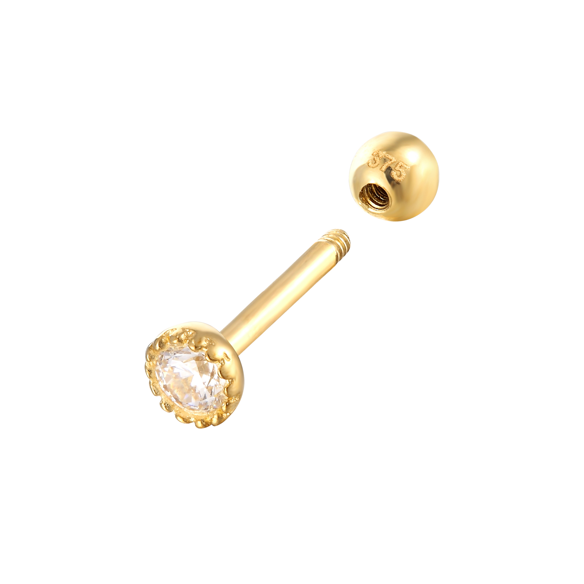 This item is a single 9 carat yellow gold screw back cubic zirconia stud. Wearable either in the standard ear piercing – or alternatively in various other positions such as the tragus or the labret. The stud is presented in a small gift box – making it perfect for gifting.