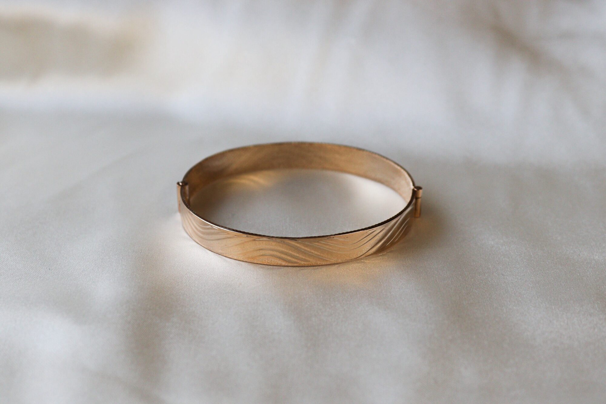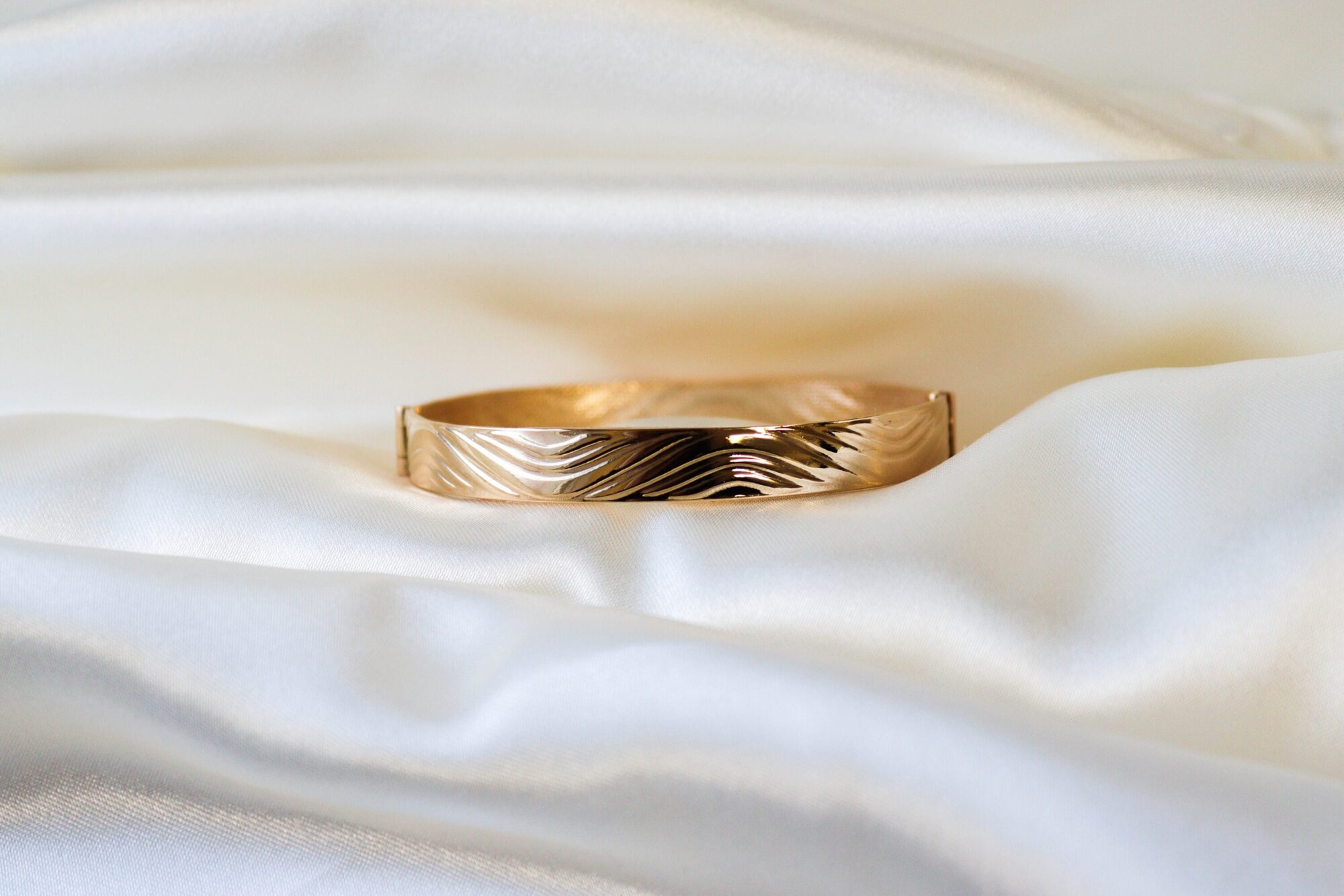 Made from 9ct rolled gold, this simple waved line bangle is a beautiful accessory that will go with any look, from day to night. In a hinged style, this bangle is perfect for wearing alone or stacked with multiple bracelets- perfect for styling however you want to!Measures at 62mm in circumference.Please note that if you are ordering more than one item that they will arrive in only one gift box. If you need more than one gift box then please message us and let us know!