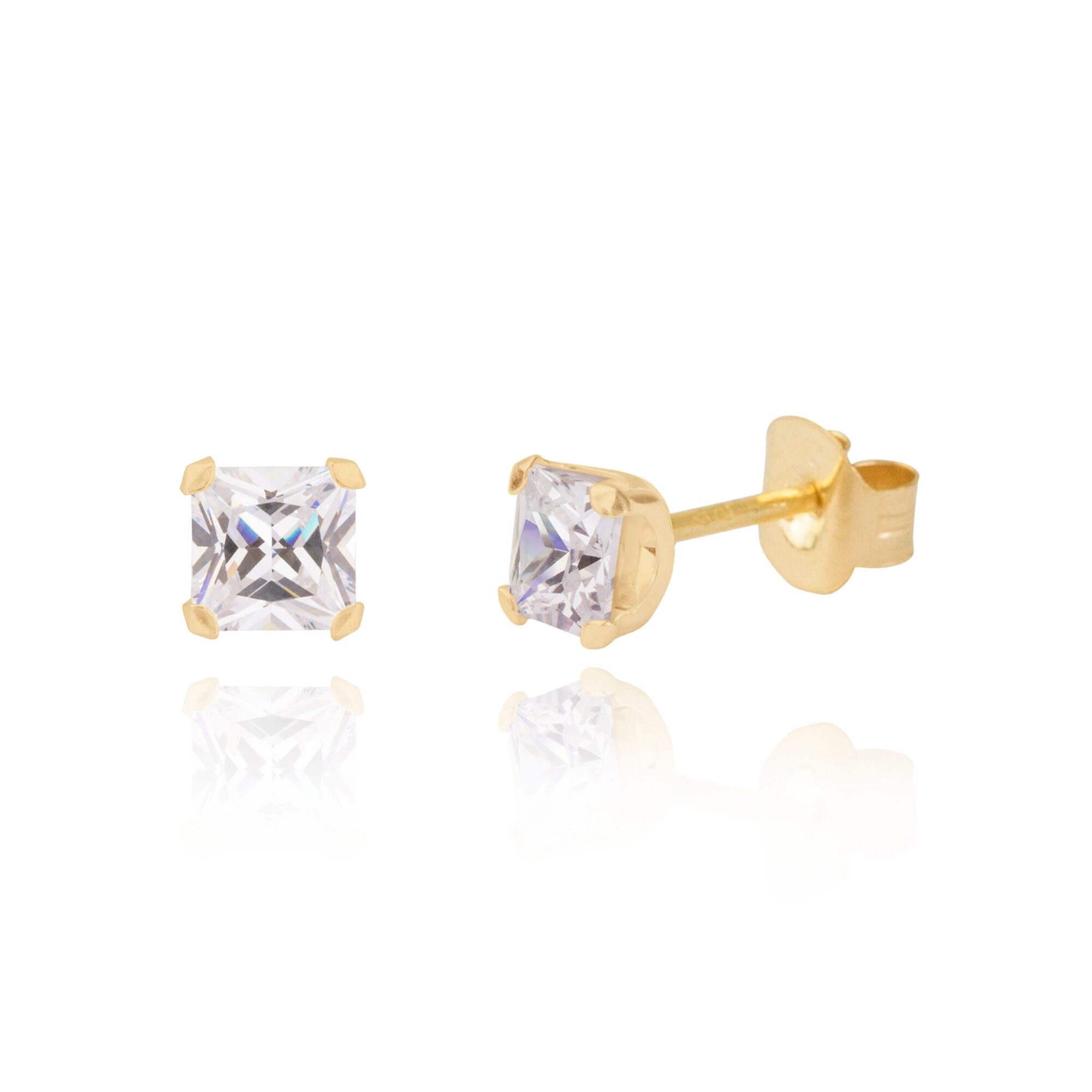 This beautiful pair of classic stud earrings is handmade in the UK from 9ct yellow gold and they fasten behind the ear with butterflies. With a square princess cut white cubic zirconia stone set at its four corners, these earrings sparkle and look fabulous on! Delivered in a fine linen gift box, these earrings are ready to give to someone special.