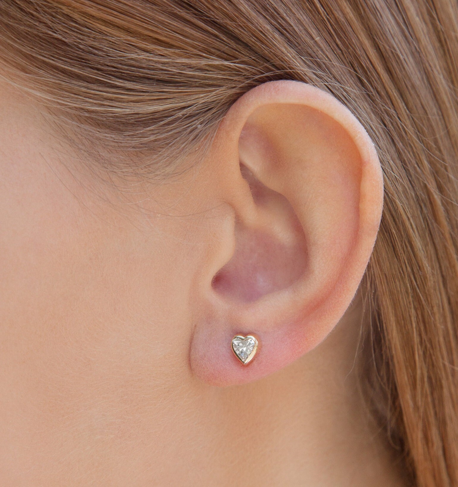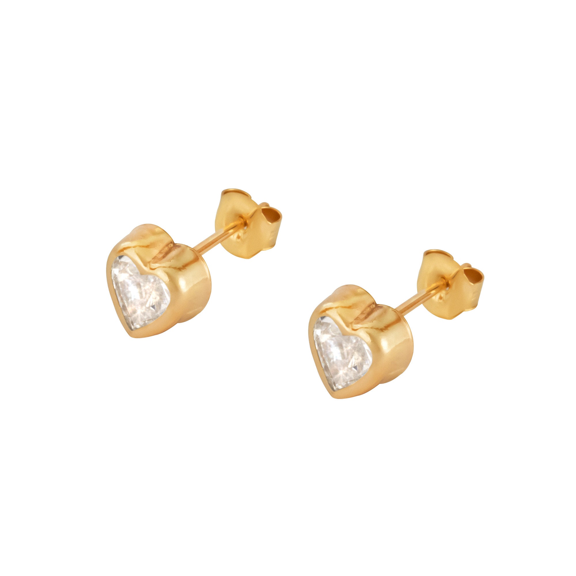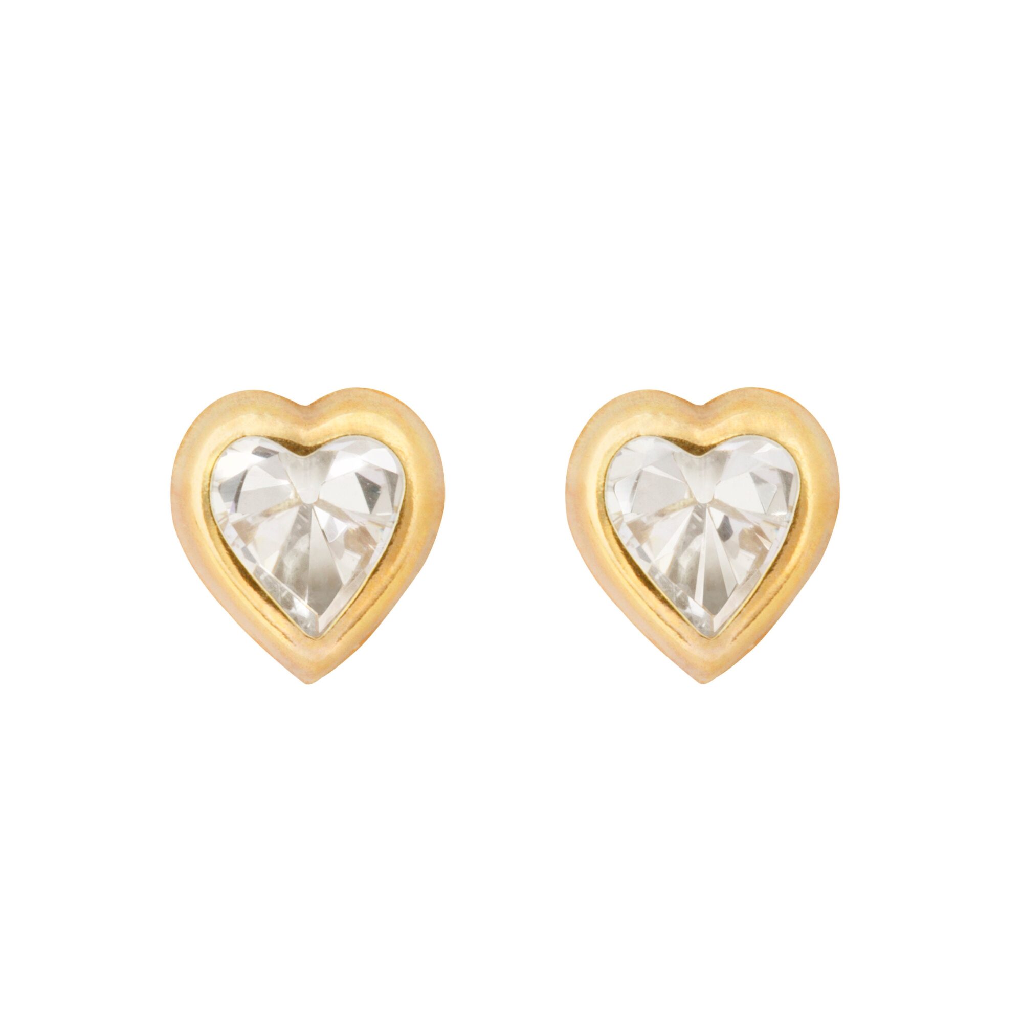 These heart rubover stud earrings are manufactured and hand-finished in the UK from 9ct yellow gold and they fasten behind the ear with butterflies. With a sparkling cubic zirconia set from behind, the finish on these studs feels smooth to the touch giving a very classy look. The earrings are supplied in a beautiful presentation box, making them the ideal gift for someone special.
