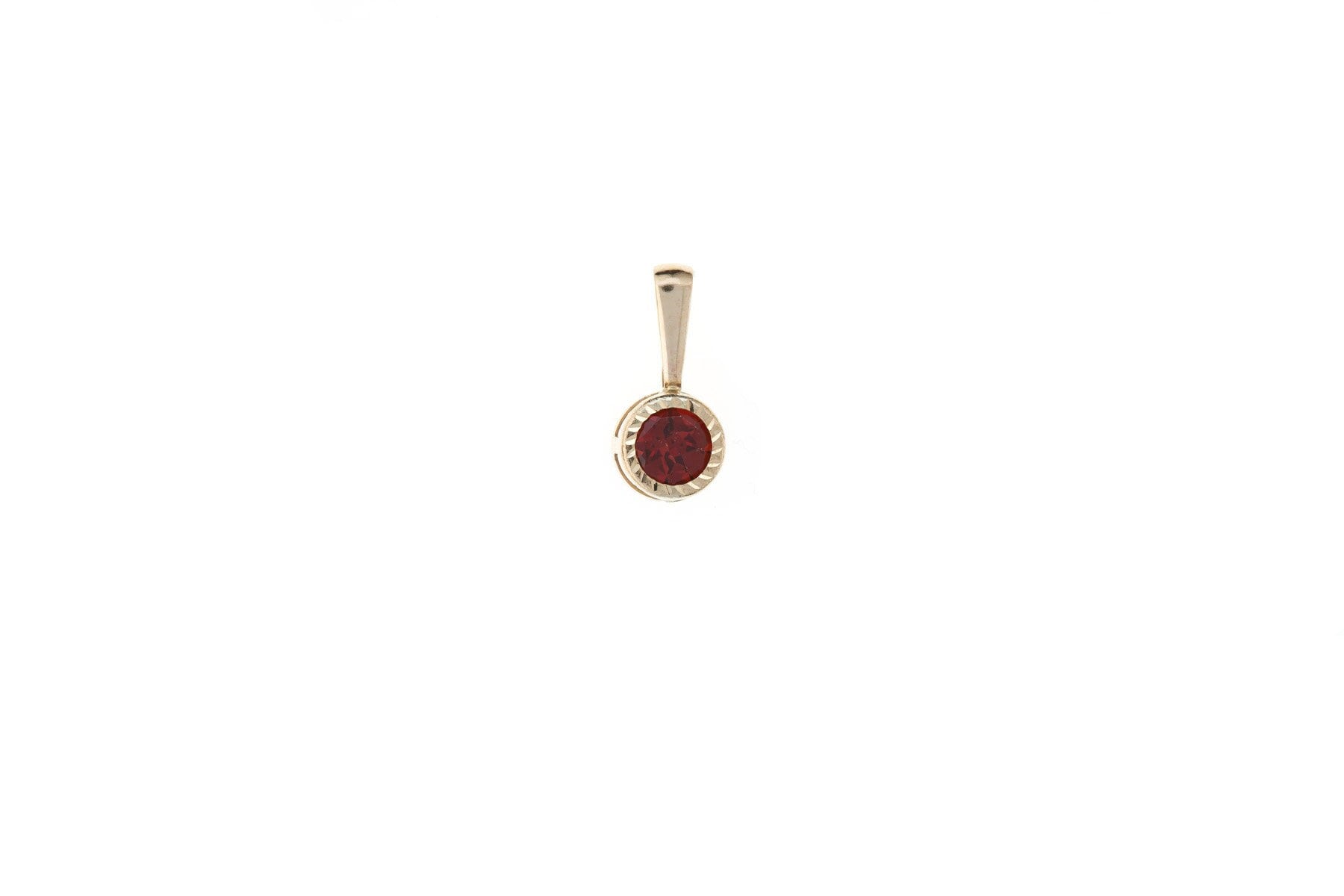 This rubover style round pendant is handmade in the UK from 9ct yellow gold. The round garnet stone is set within a gold cage fitting with a diamond cut edge giving the piece a smooth, rubbed over finish as well as a sparkling shine. Sold without a chain. Delivered in a gift box.5mm (w) x 12mm (h)