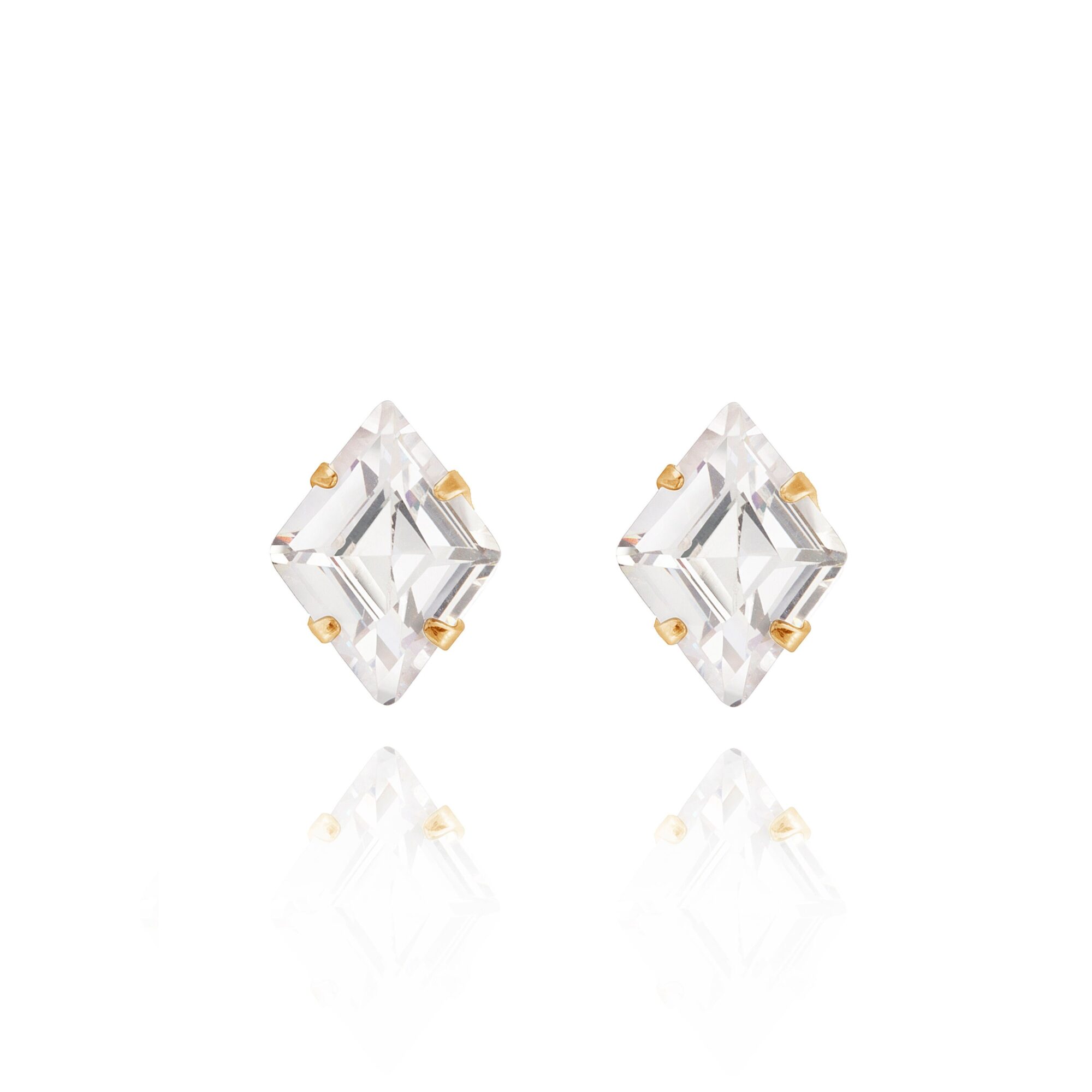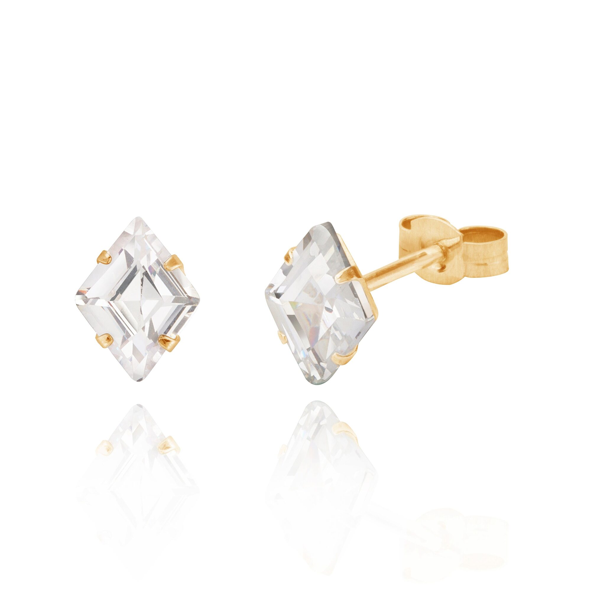 This beautiful pair of stud earrings is handmade in the UK from 9ct yellow gold and they fasten behind the ear with butterflies. With a lozenge shaped white cubic zirconia stone set on its four sides, these earrings sparkle and look fabulous on! Arriving in a gift box, these earrings are ready to give to someone special.