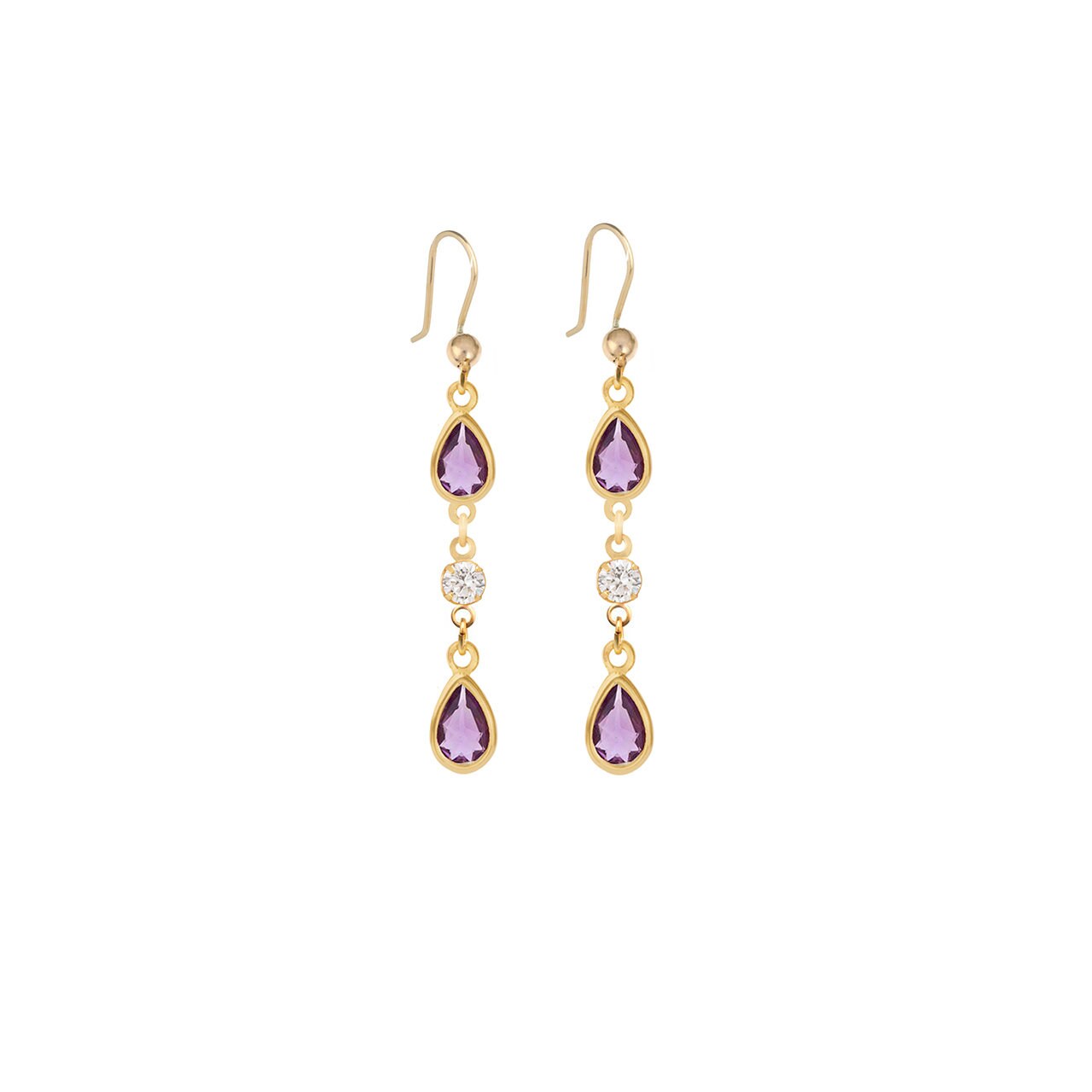 Handmade in the UK from 9ct yellow gold, this beautiful pair of drop earrings have two tear shaped Amethyst stones and one circular Cubic Zirconia set in the middle of each of the earrings. With a hookwire these earrings are comfortable and light weight, suitable for everyday wear. Delivered in a fine linen gift box, these earrings are ready to give to someone special.