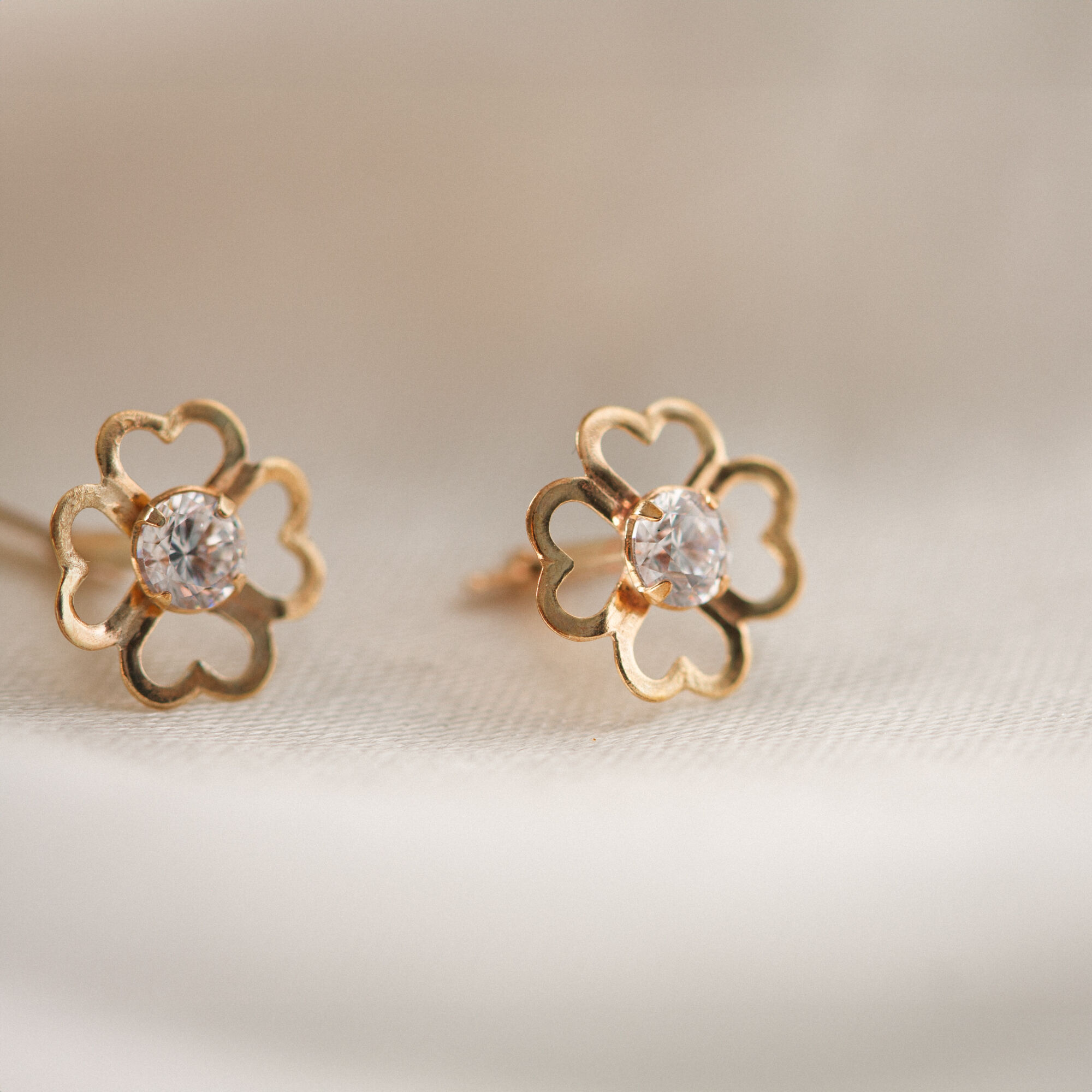 These gold clover cz stud earrings have a bright, polished look that feels easy to wear. The open clover shape keeps the design light on the ear. At the same time, the central cubic zirconia adds a clear point of sparkle. The result feels refined, feminine, and well-balanced.
