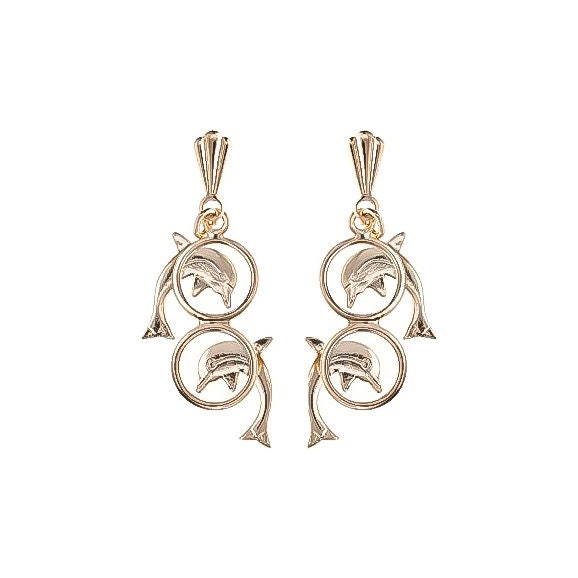 The dolphins are set within polished gold surrounds, giving the piece a subtle nautical influence while keeping the overall look refined. The layered construction allows light to move across the surfaces as the earrings are worn.