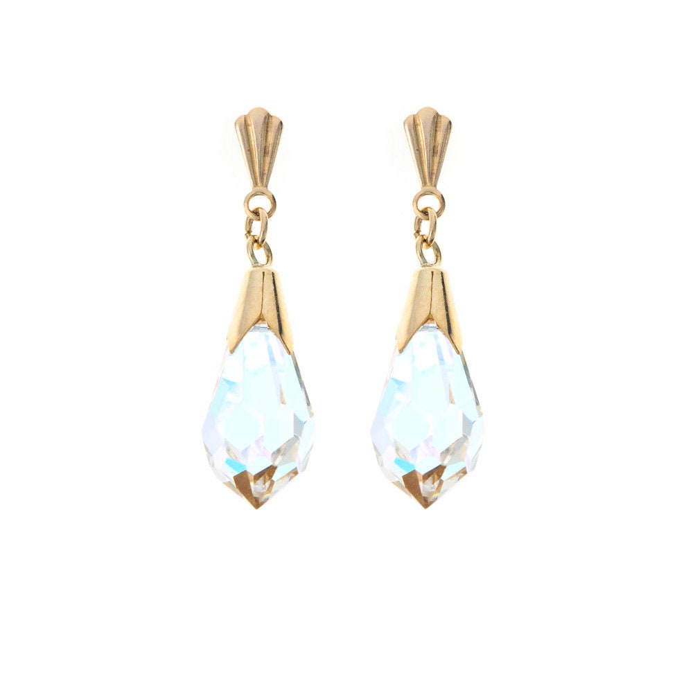 As a result, the 9ct gold aurora borealis teardrop earrings feel luminous rather than flat. The crystal reflects subtle flashes of colour, and the polished gold fitting frames the drop cleanly without distracting from its depth.