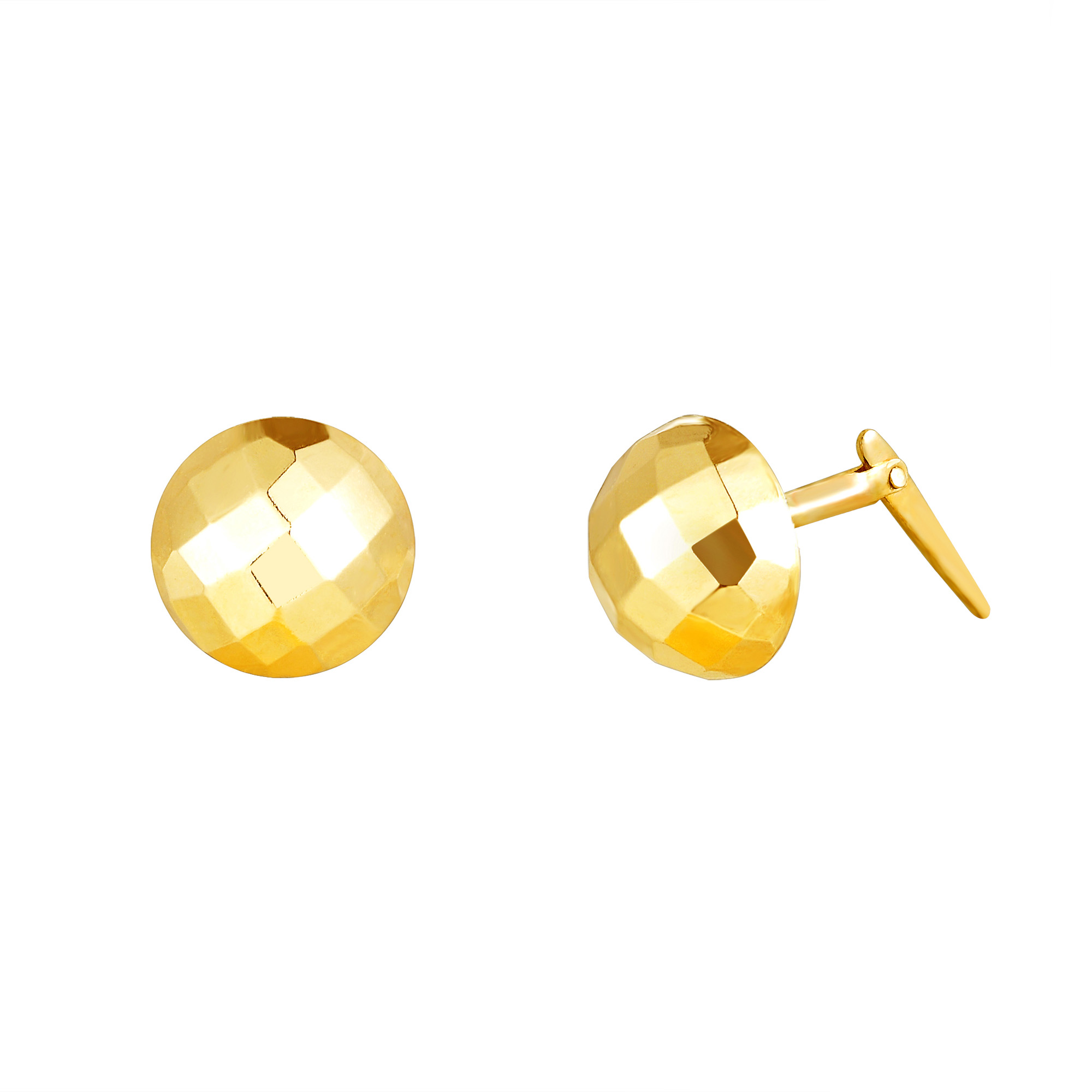 These faceted gold dome stud earrings bring structured shine to a classic rounded silhouette. The smooth dome form is finished with multiple polished facets, creating a subtle geometric pattern across the surface. As light moves across each angled section, the earrings reflect controlled highlights without appearing overly decorative.