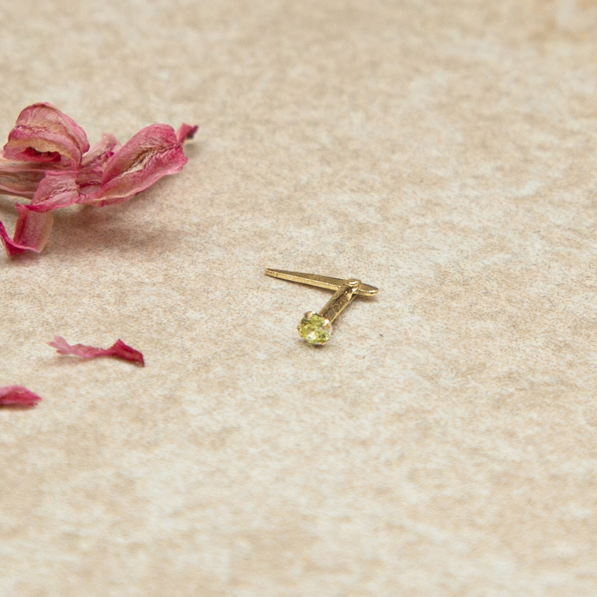The contrast is what gives this piece its character. On one side, the yellow gold setting adds softness and warmth. On the other, the light green stone brings a brighter note that feels clean and uplifting. As a result, the nose stud feels distinctive without becoming too bold. It has more presence than a plain gold style. Even so, it still sits neatly and keeps a subtle overall look once worn. Because of that balance, it works beautifully for everyday styling.