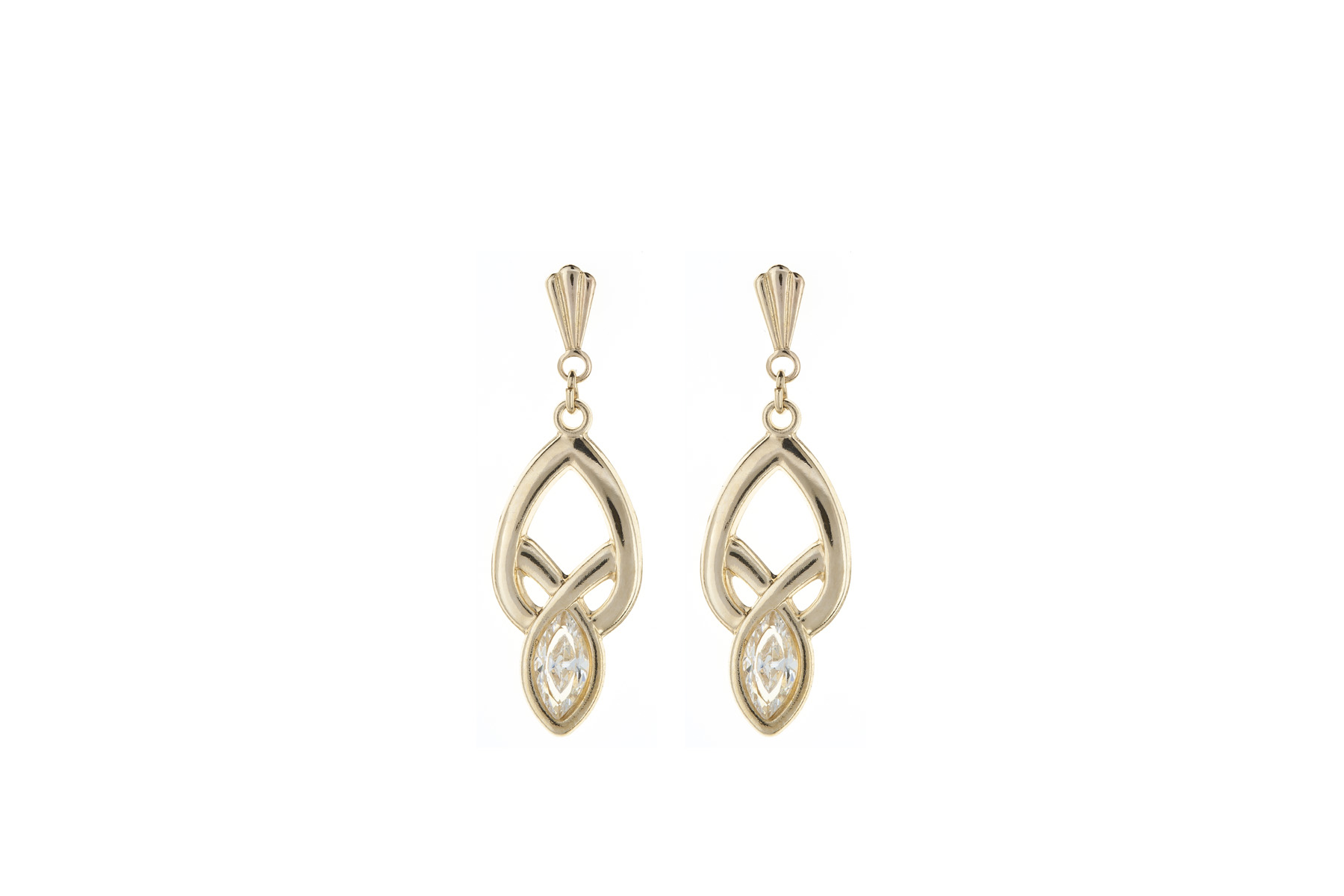 These gold marquise CZ earrings are crafted in solid 9ct yellow gold and feature a refined open crossover design. The elongated marquise frame creates a graceful silhouette, while the marquise-cut white cubic zirconia at the base adds brilliance and clarity.
