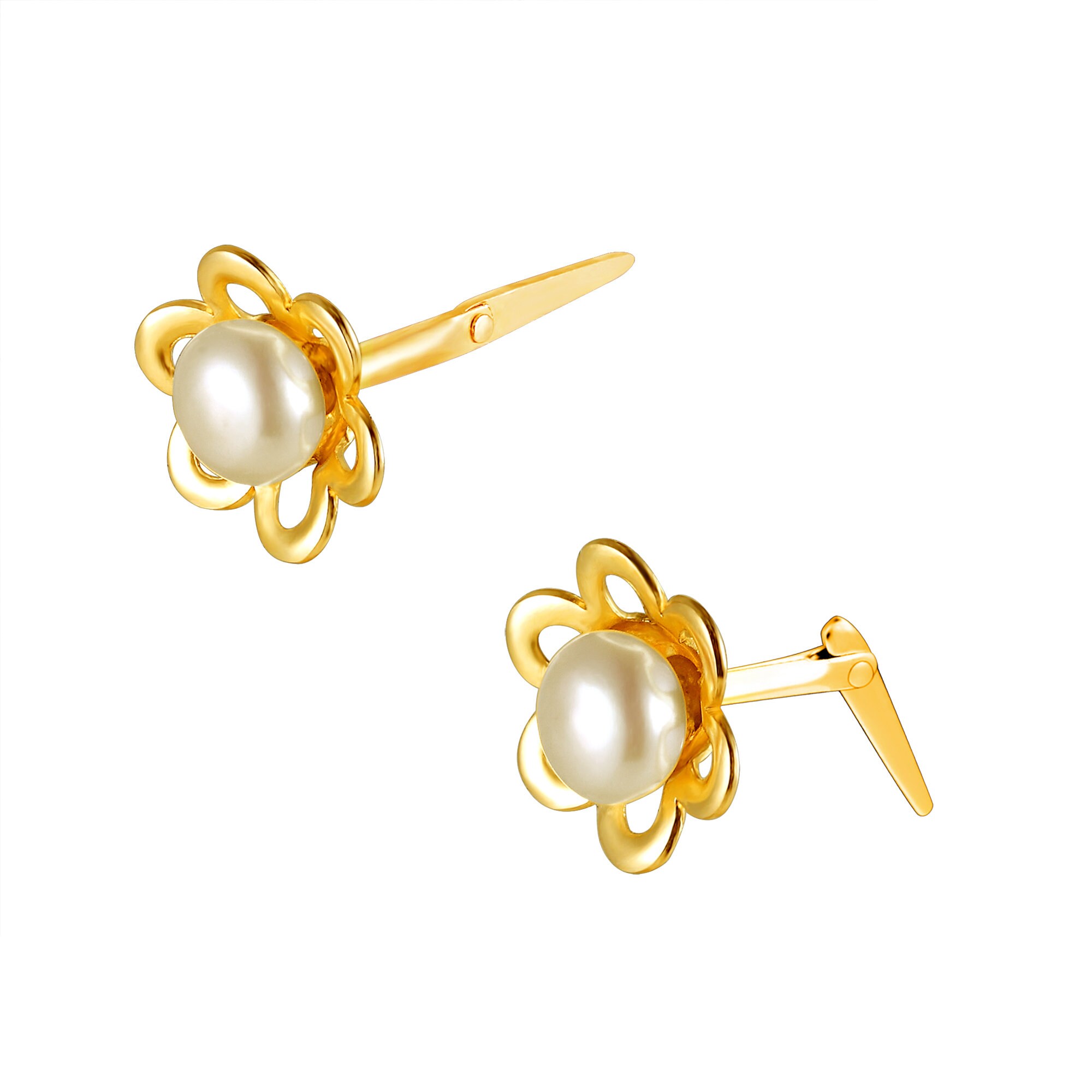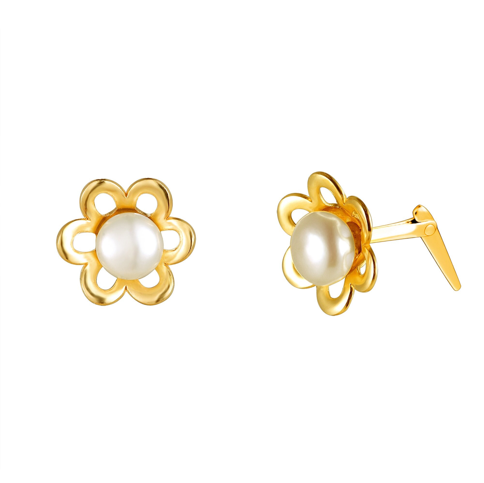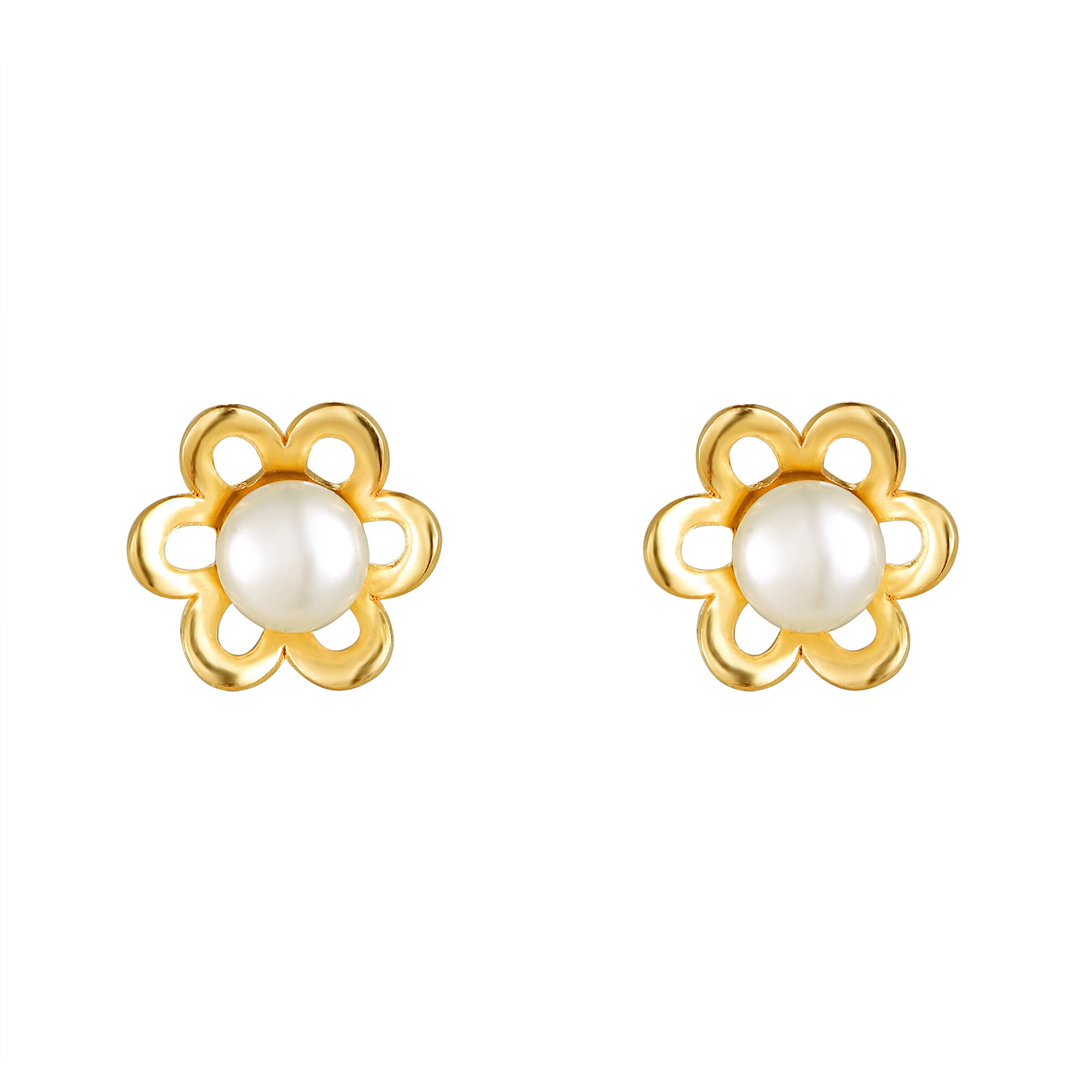These pearl daisy stud earrings combine classic cultured pearl elegance with a soft floral silhouette. At the centre of each piece sits a round cultured pearl, framed by a symmetrical gold daisy design that creates a balanced circular profile.