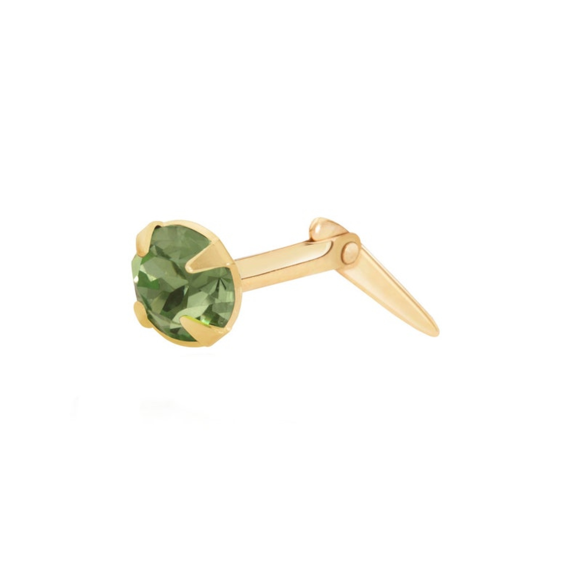 The round shape keeps the overall design clean and lets the stone do the work. This style is available in 2mm, 3mm and 3.5mm sizes, so you can choose how subtle or noticeable you want the finished result to be. The 2mm size gives just a neat point of green. The 3mm option feels more visible while still staying understated. The 3.5mm size shows the peridot tone most clearly and gives the design its strongest presence. Each one keeps the same polished gold outline and faceted round finish.