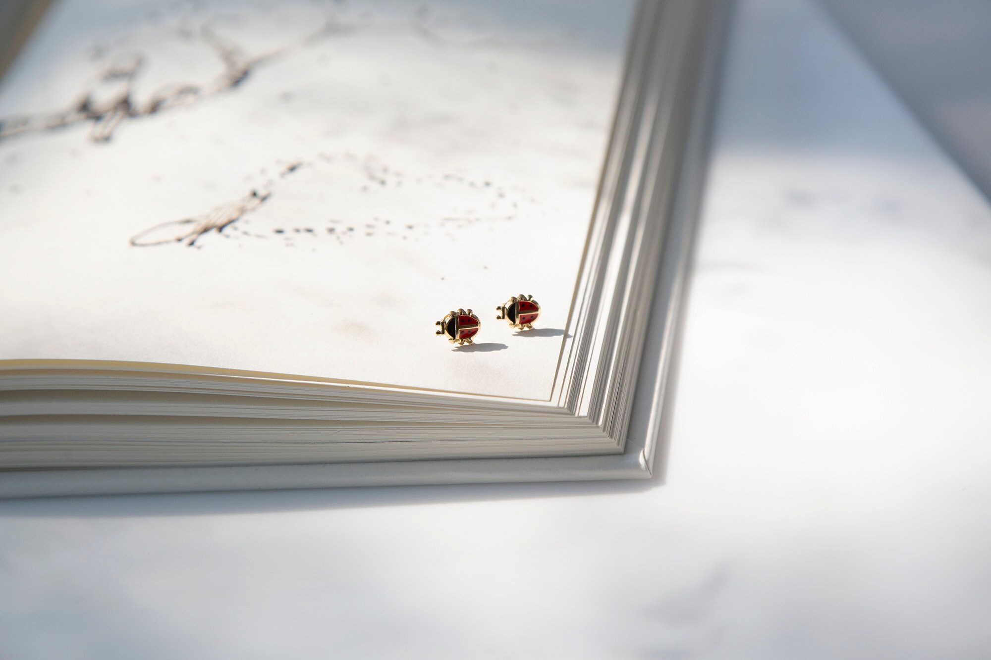 The rich red enamel contrasts against the warm yellow gold, allowing the ladybird form to stand out clearly. As light catches the smooth gold surface, the enamel retains depth and colour. Therefore, these gold ladybird stud earrings feel both playful and considered.