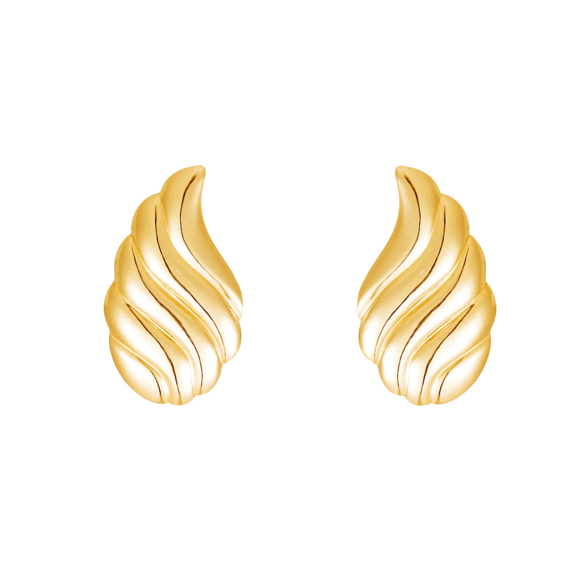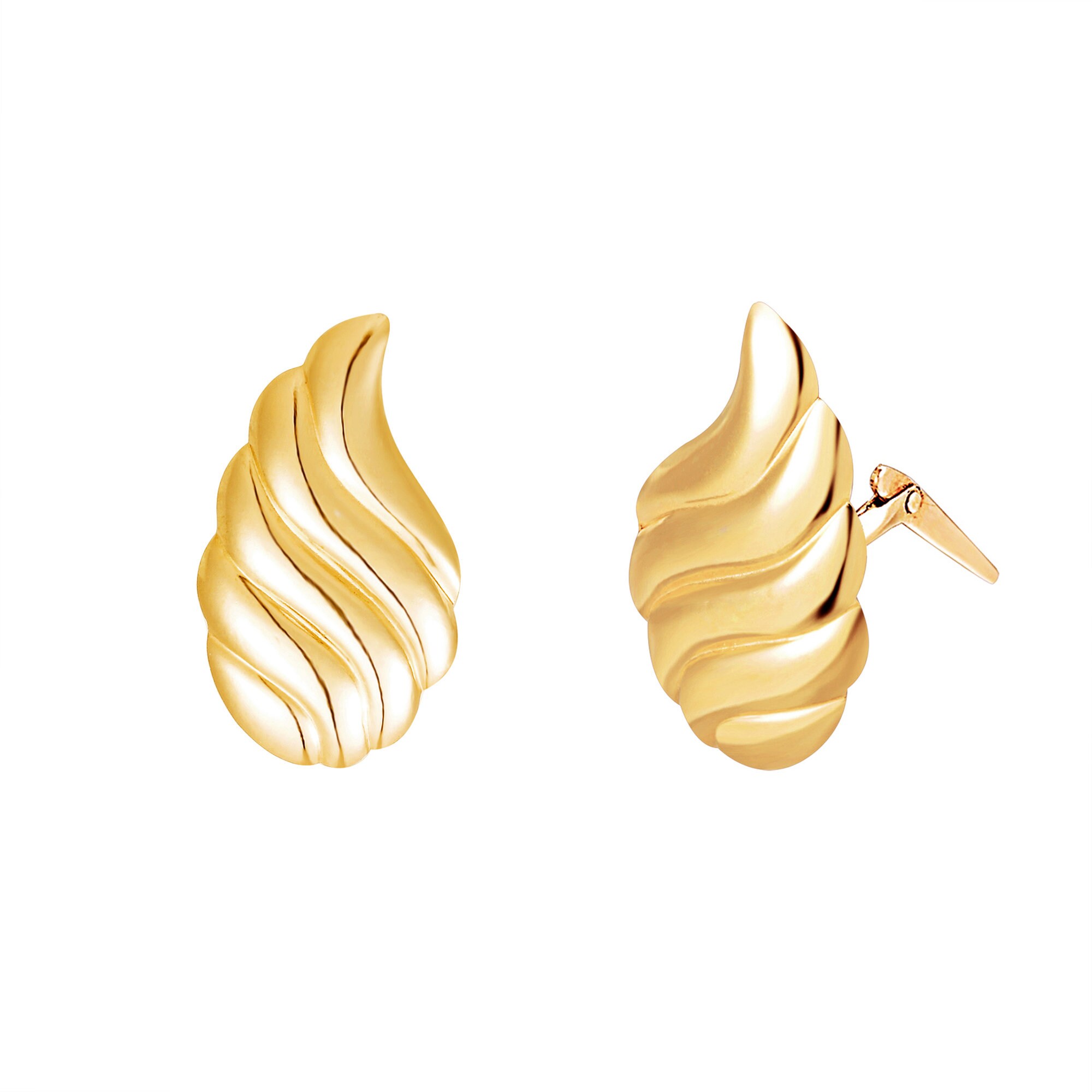 The smooth polished surface enhances each sculpted ridge. As light travels across the curved layers, highlights define the contours and reinforce the dimensional structure. This interplay between shadow and reflection keeps the earrings refined and architectural rather than ornate.