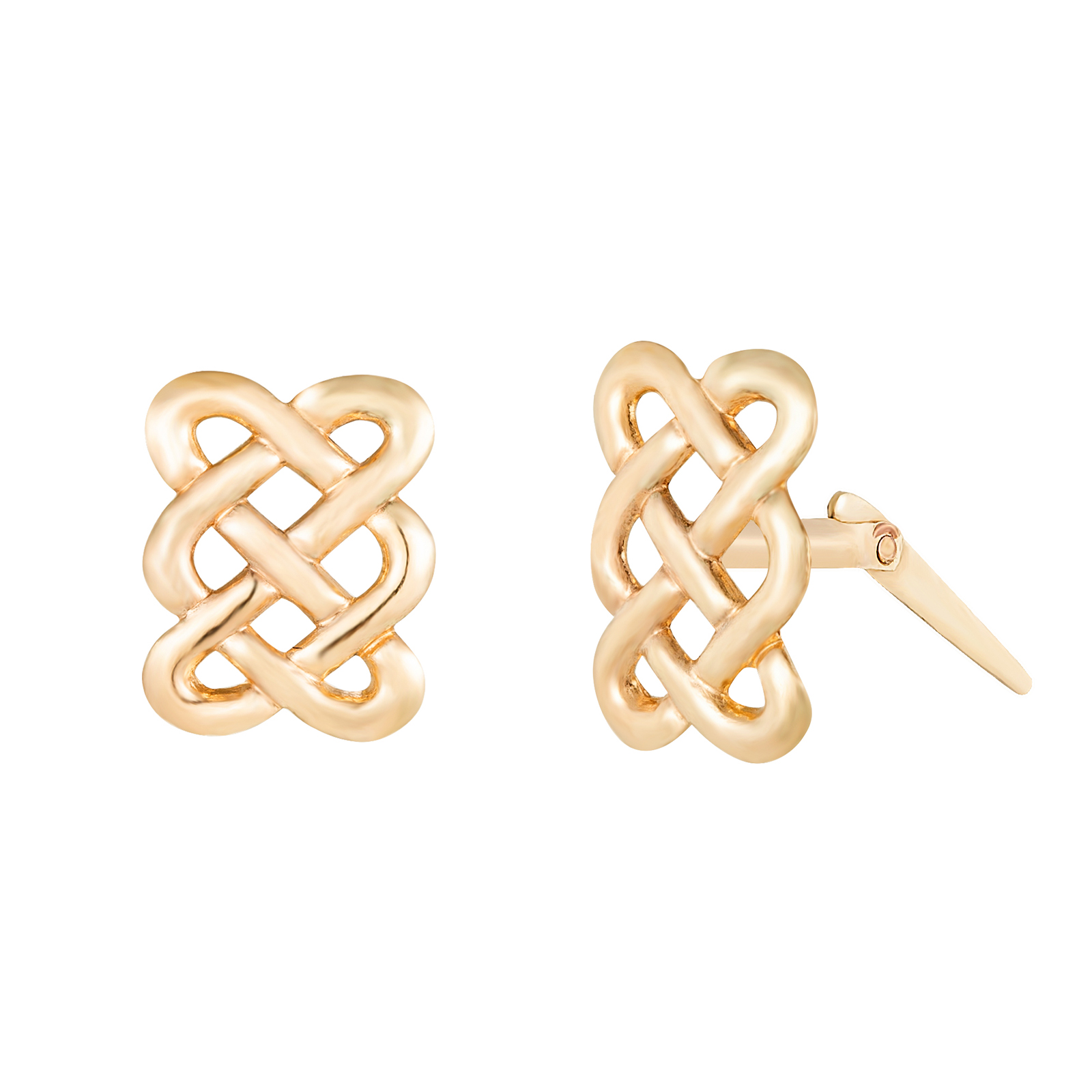 Crafted in solid 9ct yellow gold, the polished finish enhances the sculpted curves and highlights the dimensional knot structure. At 7mm (W) x 9mm (H), the proportions feel balanced and refined, making them suitable for everyday wear while still offering enough detail to stand out.