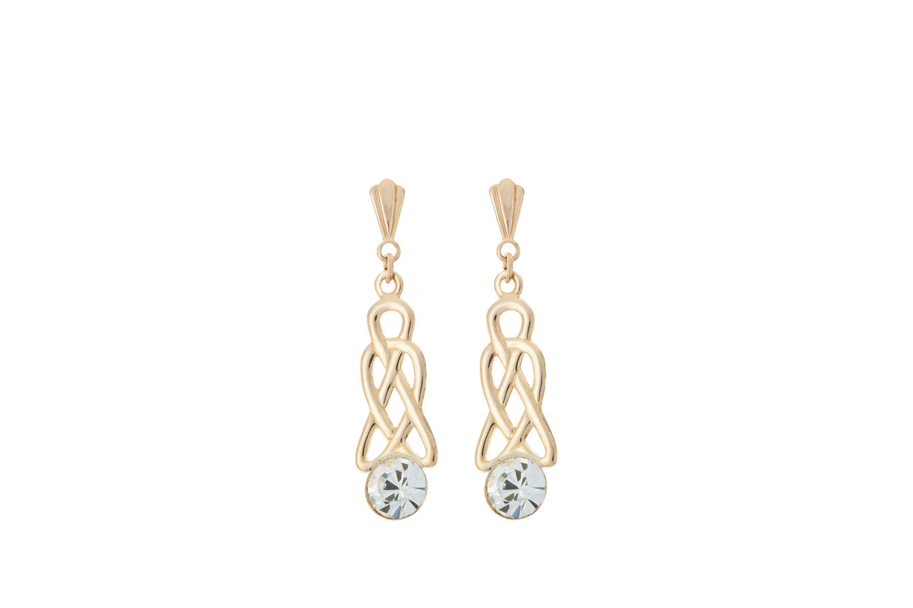 This pretty pair of Celtic wrapover white crystal earrings is handmade in the UK from 9ct yellow gold. Set with a sparkling crystal, these earrings measure 6mm (w) x 26mm (h) and make a striking finishing touch to any outfit. These earrings fasten behind the ear with butterflies and will arrive in a fine linen gift box, perfect to give to someone special.