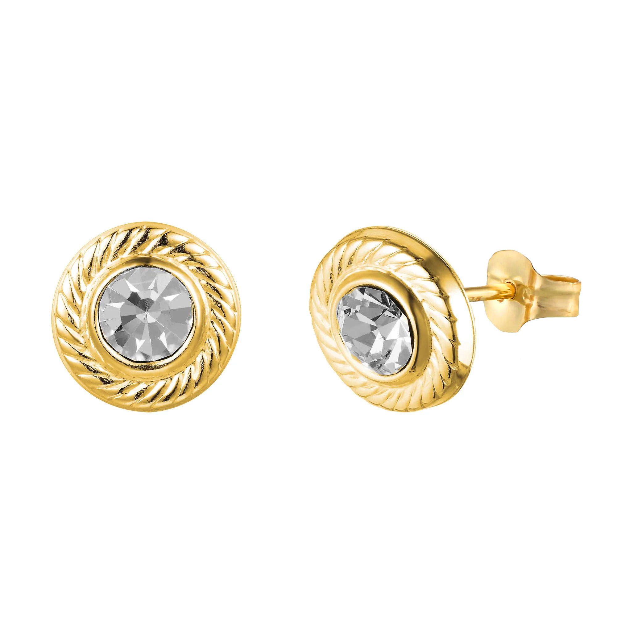 These sparkling geometric crystal circle stud earrings are handmade in the UK from 9ct yellow gold. With round white crystals set in a woven edge round fitting, these earrings make a beautiful addition to any outfit. These earrings fasten with 9ct yellow gold butterflies. These earrings come in a gift box and would make an ideal present for someone special.Measures 9mm (w) x9mm (h).