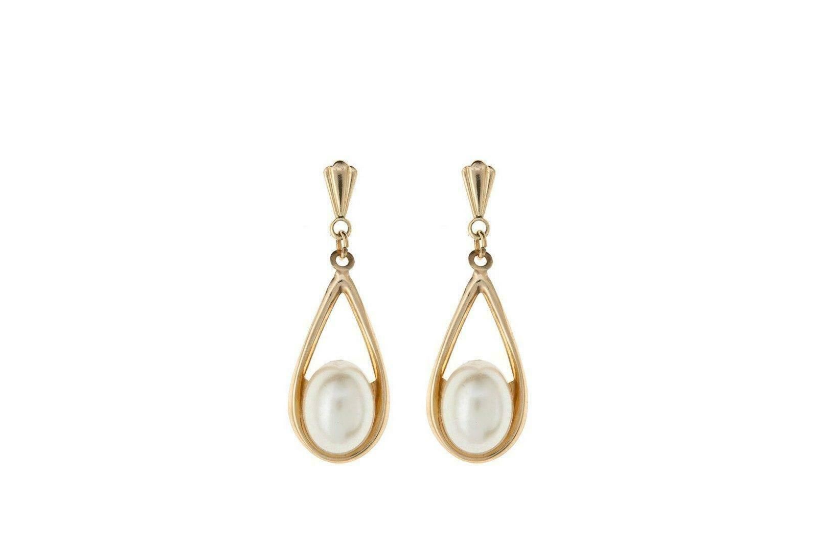 Handmade in the UK from 9ct yellow gold these beautiful oval imitation pearl drop earrings make a striking addition to any outfit. Measuring 7mm(w) x 26mm (h), these earrings fasten behind the ear with butterflies and will arrive in a fine linen gift box, perfect to give to someone special.