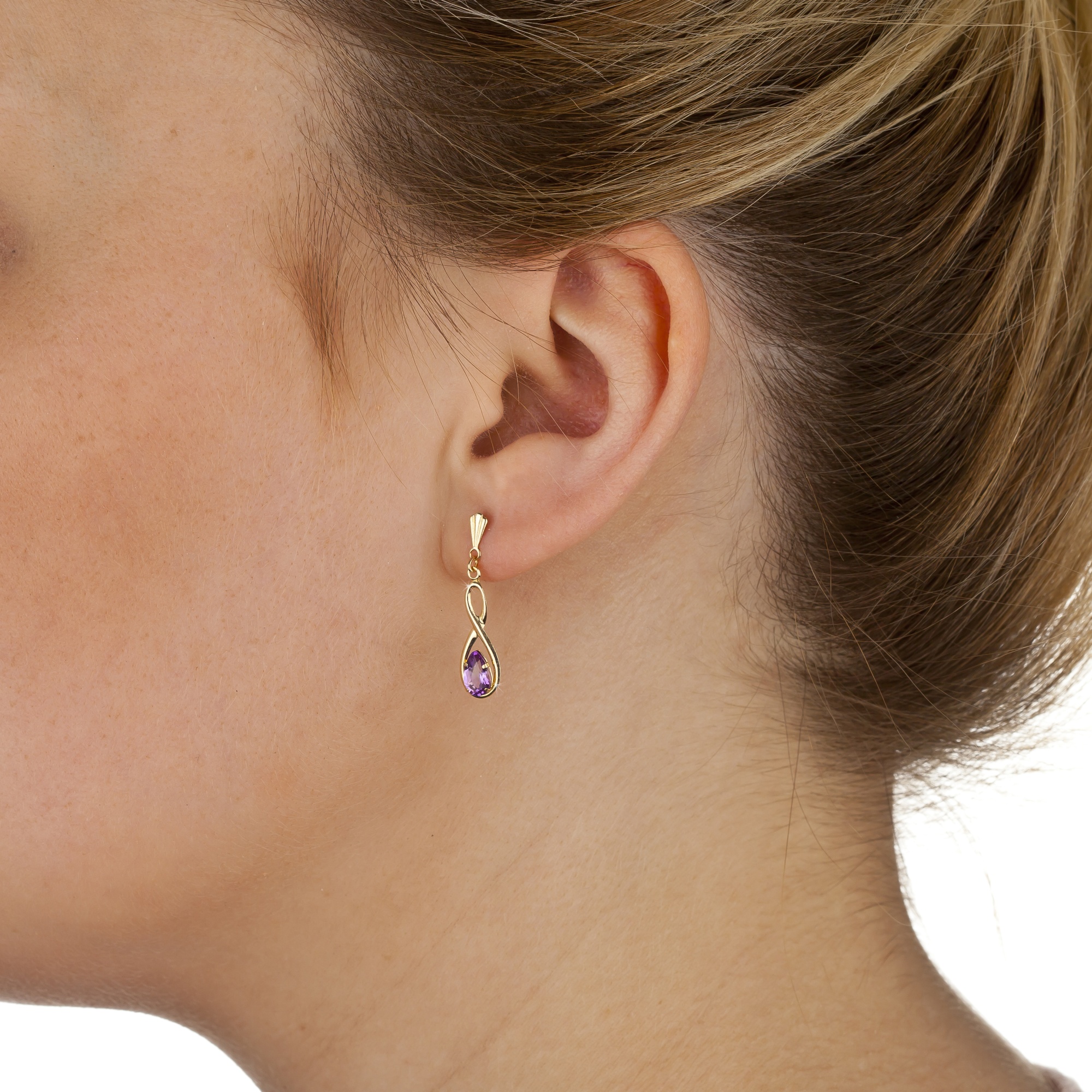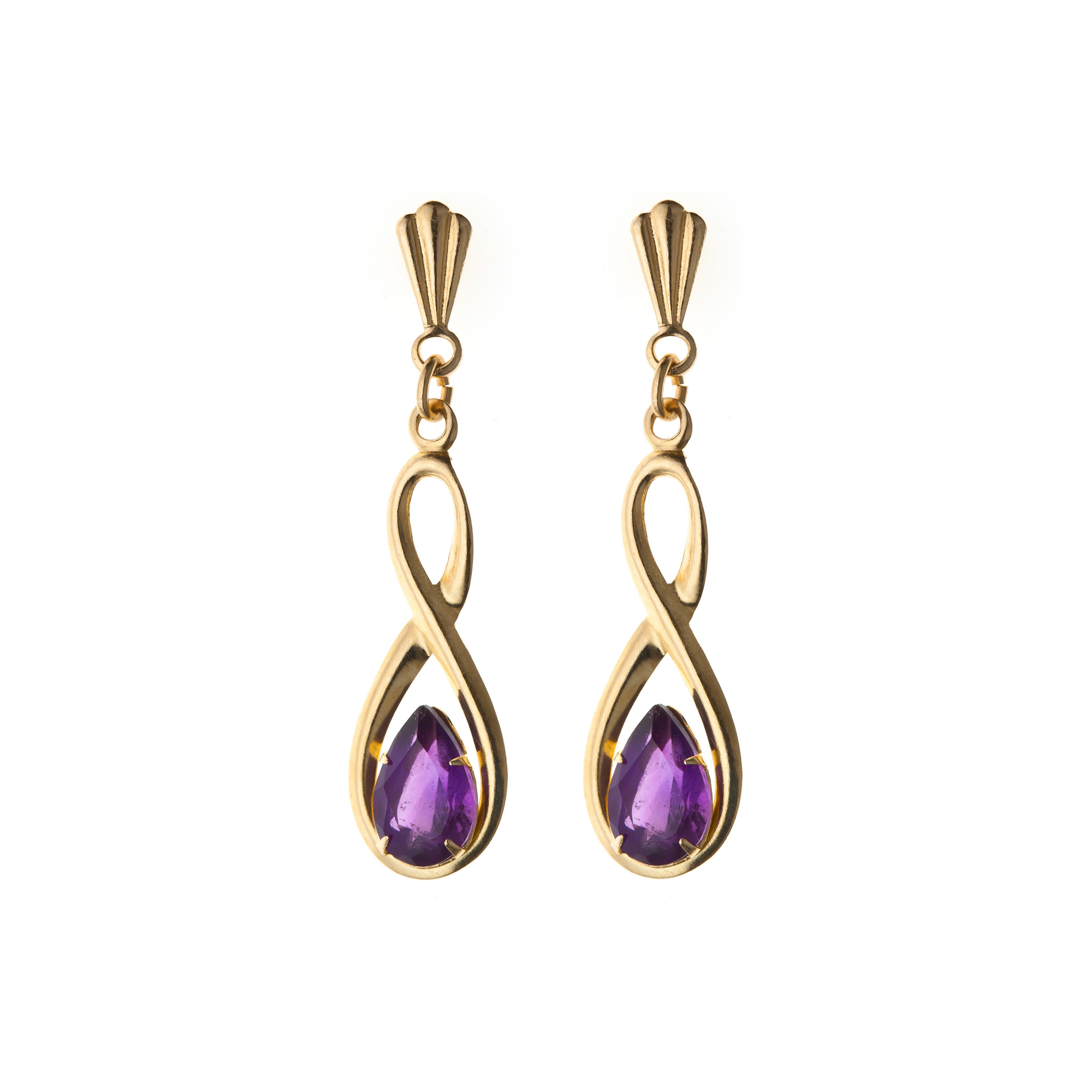 This beautiful pair of 'figure of 8' drop earrings is set with a delicate teardrop shaped amethyst stone to provide a sparkling finish to any outfit. Make a sophisticated statement with these earrings, whether dressing up for an evening out or adding some glamour to your work outfit, they will be the perfect finishing touch. Manufactured and hand-finished in the UK from 9ct yellow gold, these earrings measure 6mm x 25mm in diameter and fasten behind the ear with butterflies. The earrings come in a beautiful presentation box and would make an ideal gift for someone special.