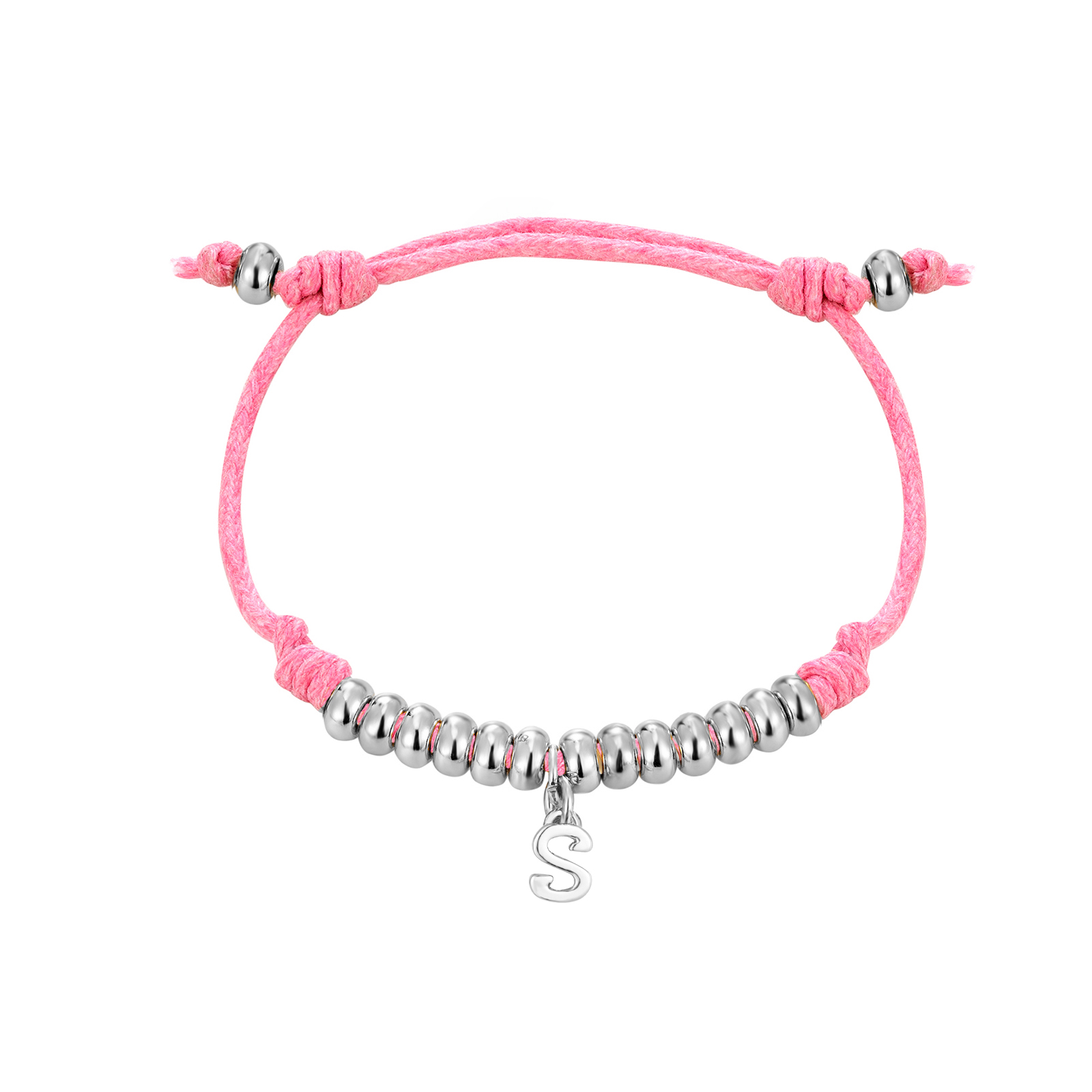 Adjustable beaded cord bracelet in pink with letter charm. The cord is approx 3mm thick, and the letters measure approx 6mm x 13mm.