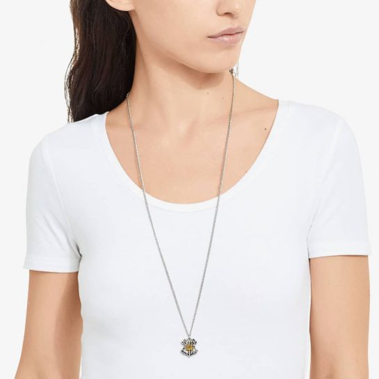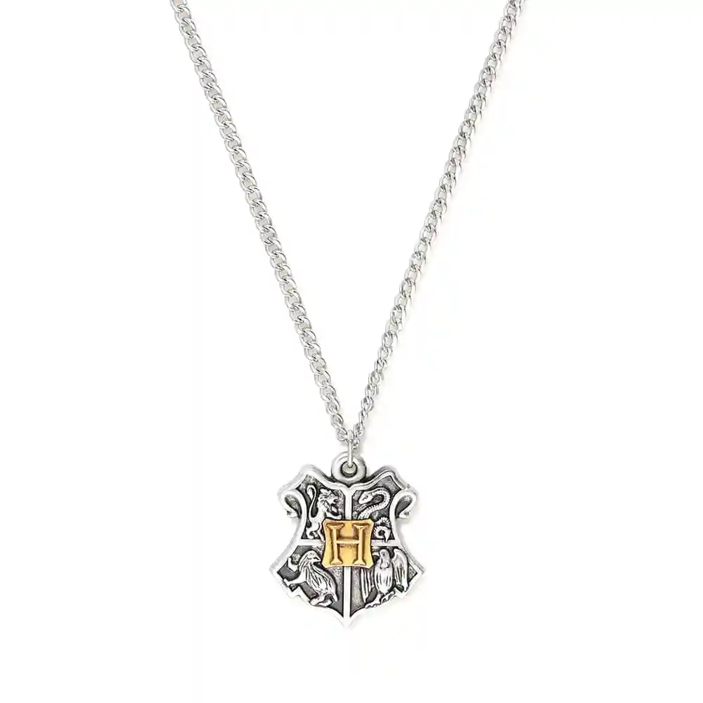 Express your love for the Harry Potter universe with this silver and gold tone ALEX AND ANI necklace. Featuring the Hogwarts School of Witchcraft and Wizardry coat of arms with each of the house’s mascots present: The Gryffindor lion, the Slytherin serpent, the Ravenclaw eagle, and the Hufflepuff badger.
