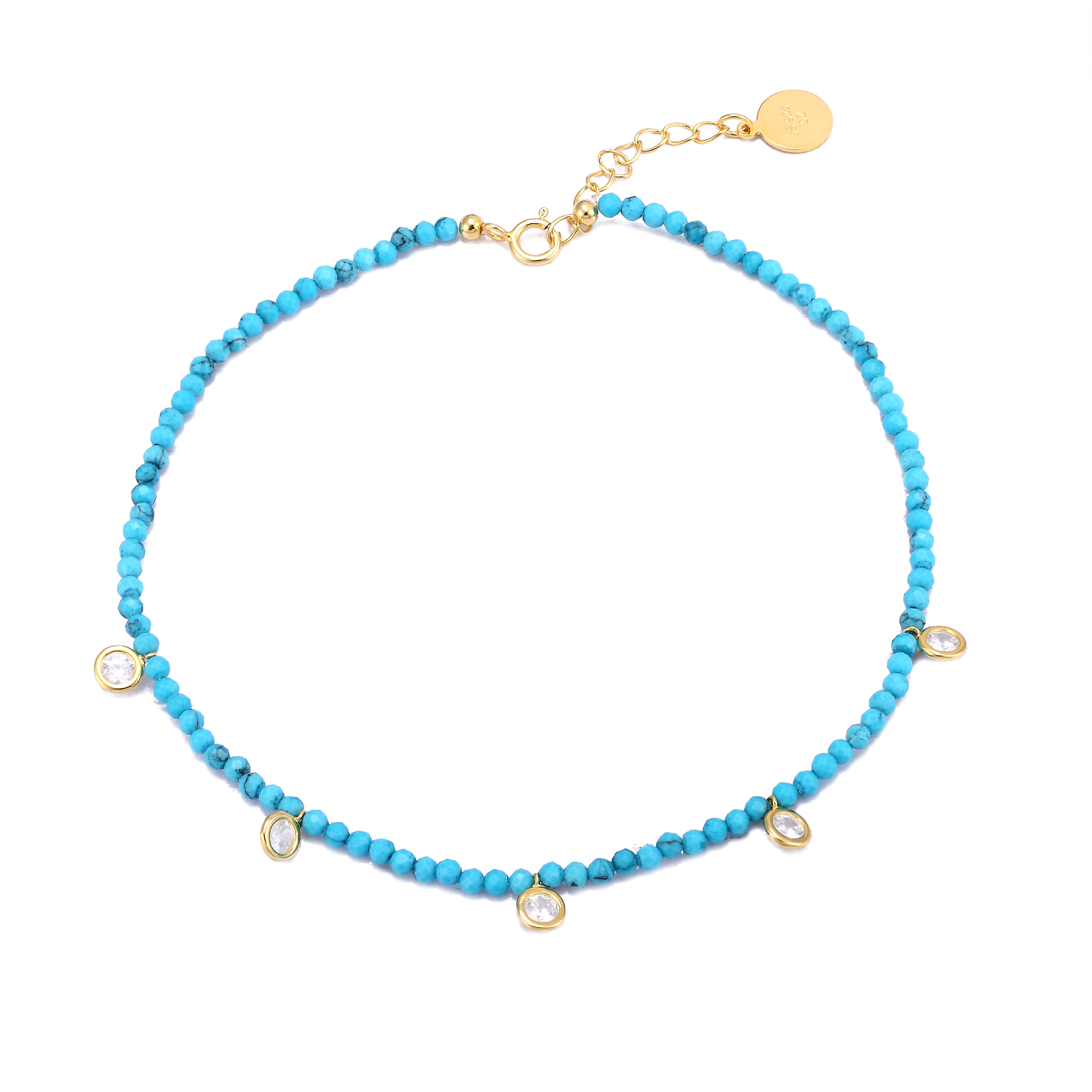 Add a splash of colour to your look with this beautiful aqua bead anklet. With classic white cz charms, this will add a touch of sparkle to any occasion. A beautiful gift for a loved one, or to treat yourself with. Comes with a 1 inch extender chain. Available in 18ct gold plated, 18ct rose gold plated, and 925 sterling silver.