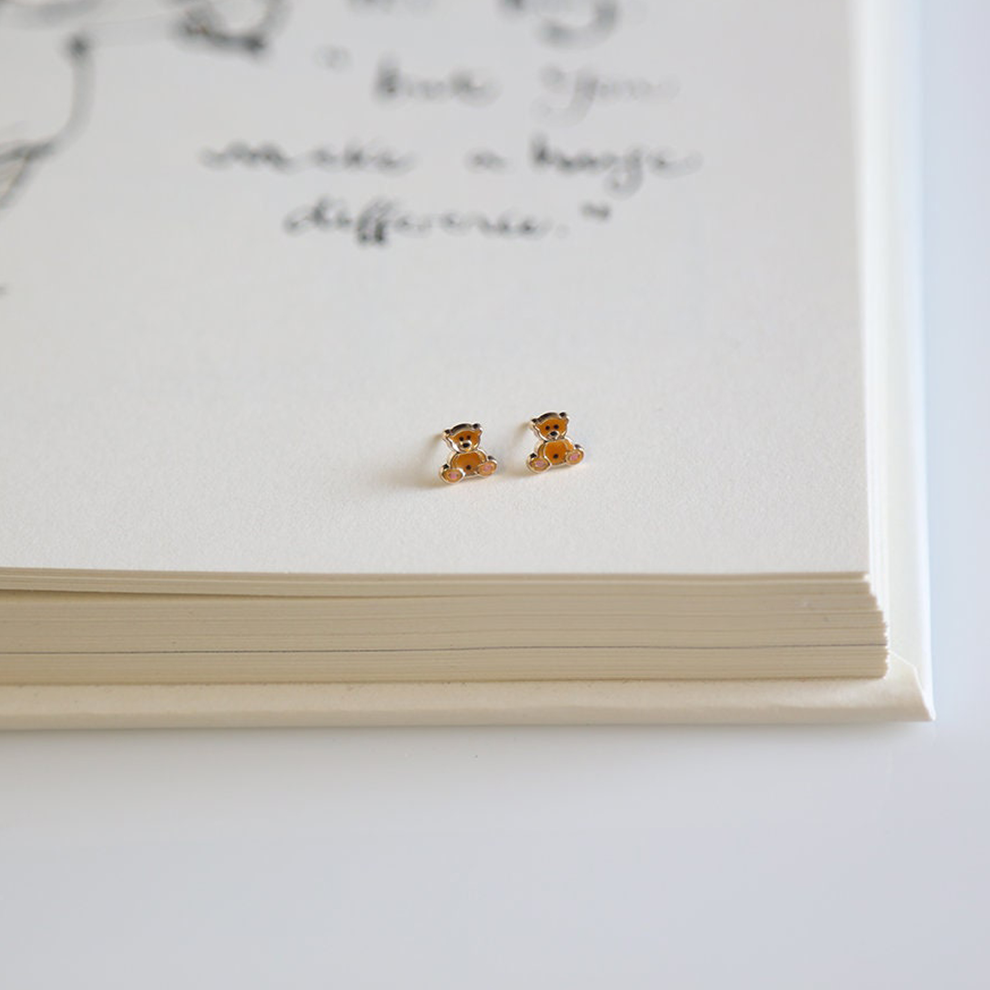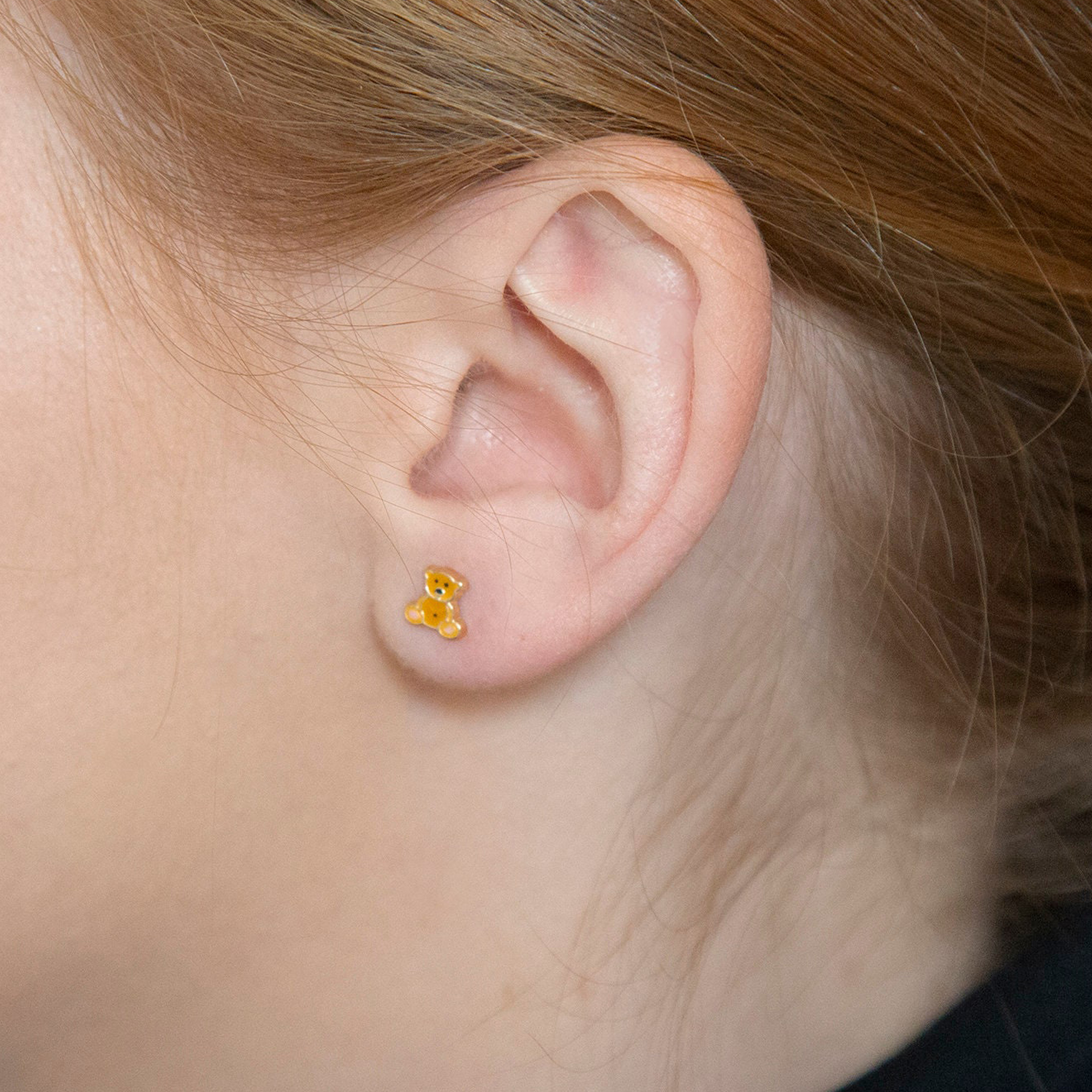 Made from 9ct yellow gold, these adorable enamel coated teddy bear studs are a fun accessory that will be a super cute gift for a little girl. Comes with the classic butterfly back fastening, perfect for day to day wear. Comes with butterfly back fastening. These earrings will arrive in a fun teddy bear novelty gift box, ready to give to someone special.