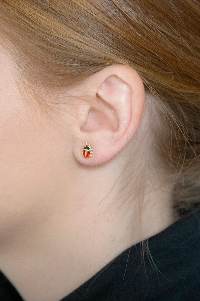 This cute pair of large enamelled ladybird stud earrings is manufactured and hand-finished in the UK from 9ct yellow gold and they fasten behind the ear with butterflies. The ladybirds are enamelled red and black and come presented in a gorgeous ladybird gift box, making them the ideal gift or stocking filler.