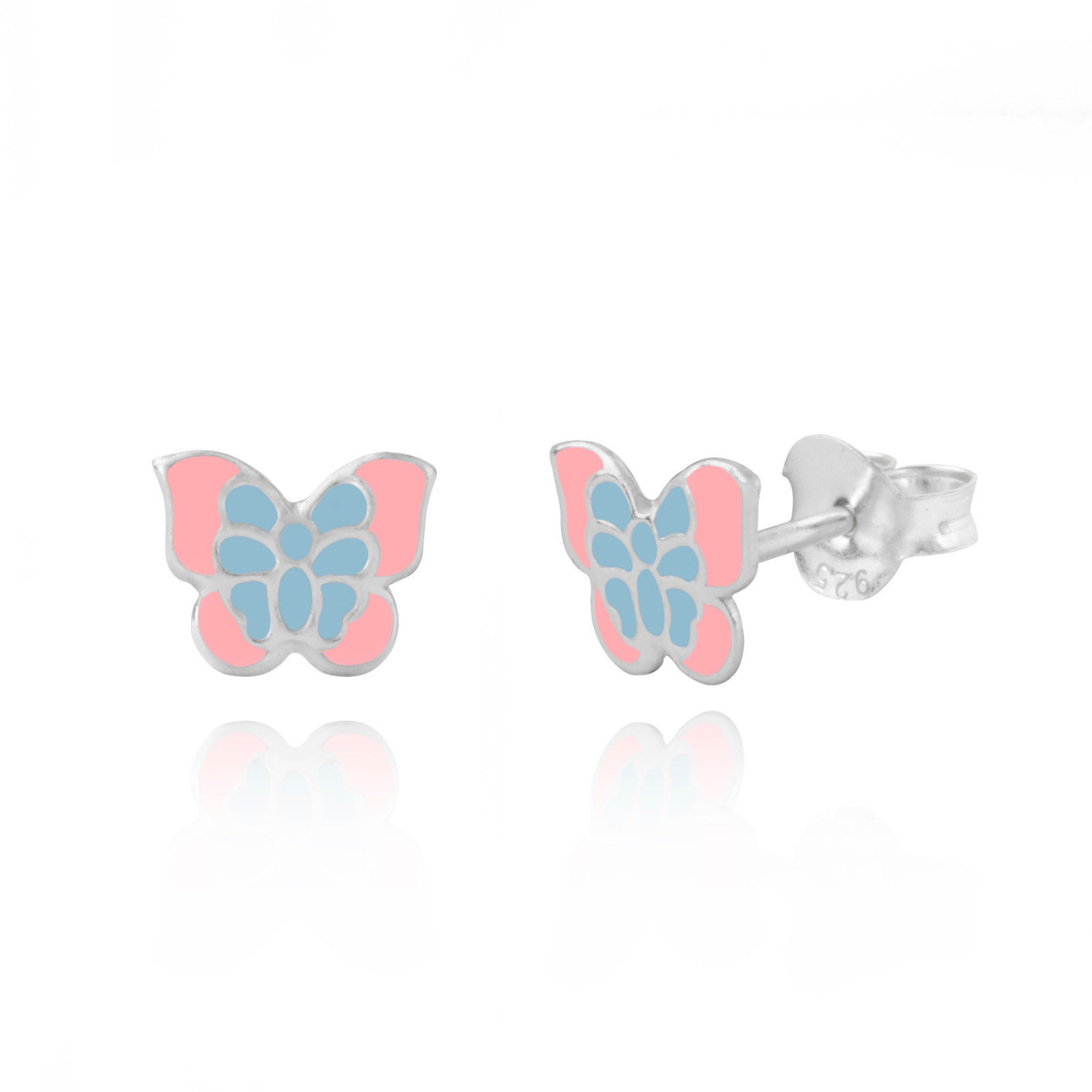 These super cute butterfly studs are perfect for little ears. With blue and pink enamel detailing, these are an adorable accessory for every occasion. Made from .925 sterling silver. Comes with butterfly back fastenings. These earrings will arrive in a fun butterfly novelty gift box, ready to give to someone special.