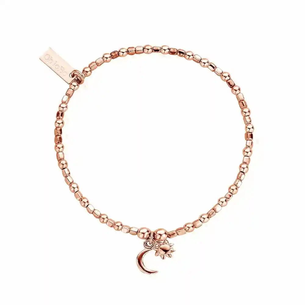 • ChloBo introduces this beautiful rose gold plated moon and sun themed bracelet made from sterling silver with beads and 2mm cubes symbolising creativity and originality.