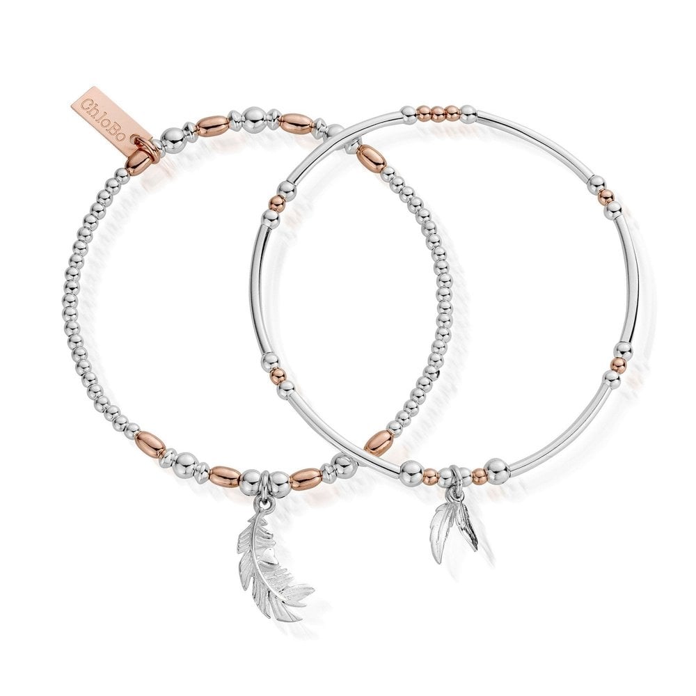 Express the freedom to live the life you have always imagined with the sentimental pairing of 925 sterling silver and rose gold plated feather bracelets. This finely detailed Strength and Courage set of two are handcrafted from a combination of classic beads to bring a textured feel to your ChloBo stack.